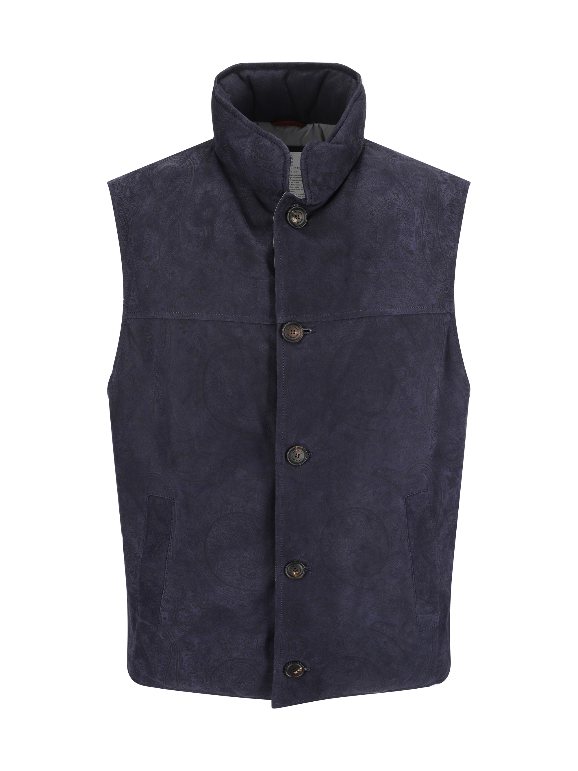 Leather Vest by Brunello Cucinelli, high collar, front button closure, two side welt pockets, all-over quilted and padded design, all-over repeated paisley pattern, regular fit.