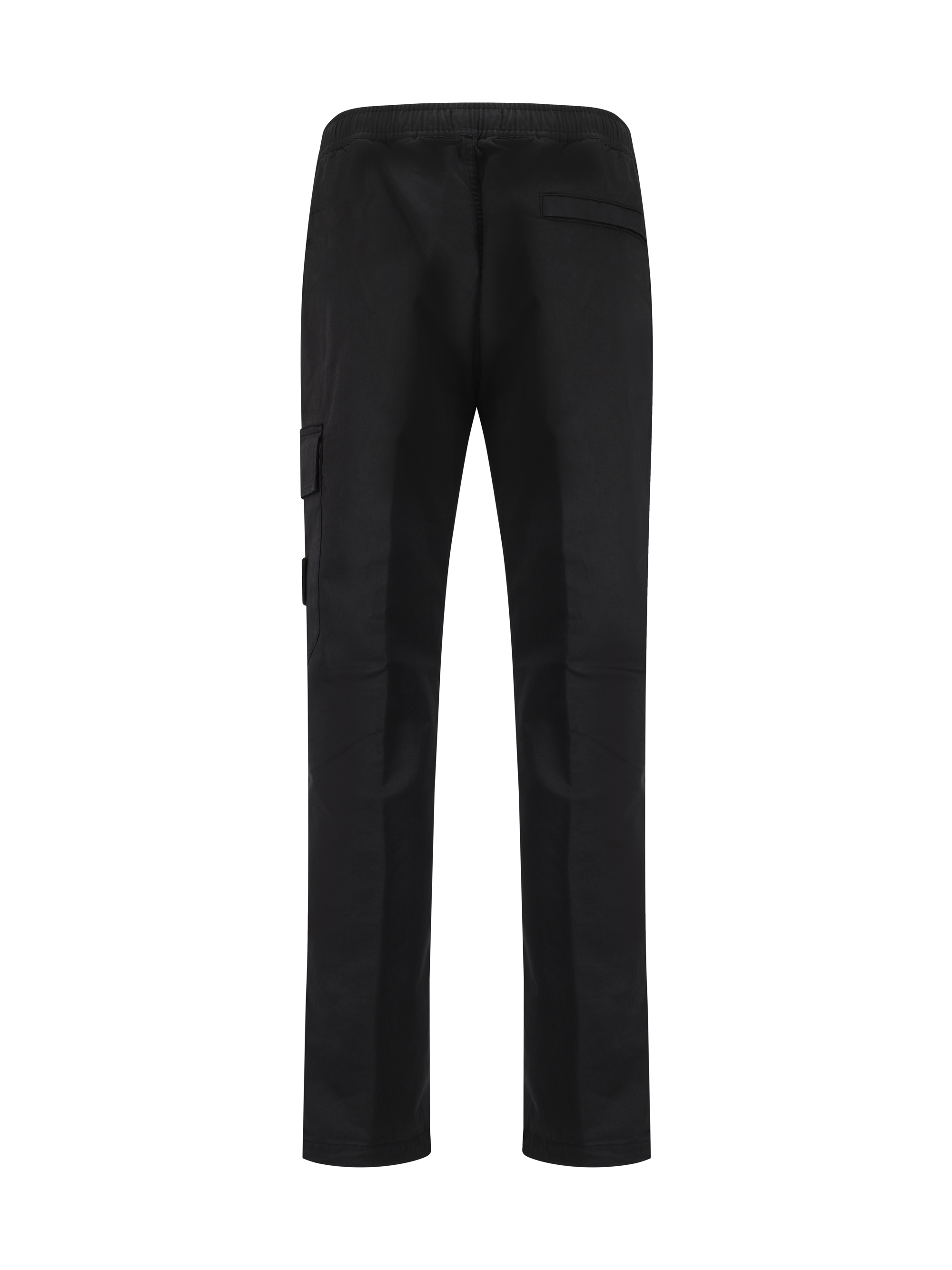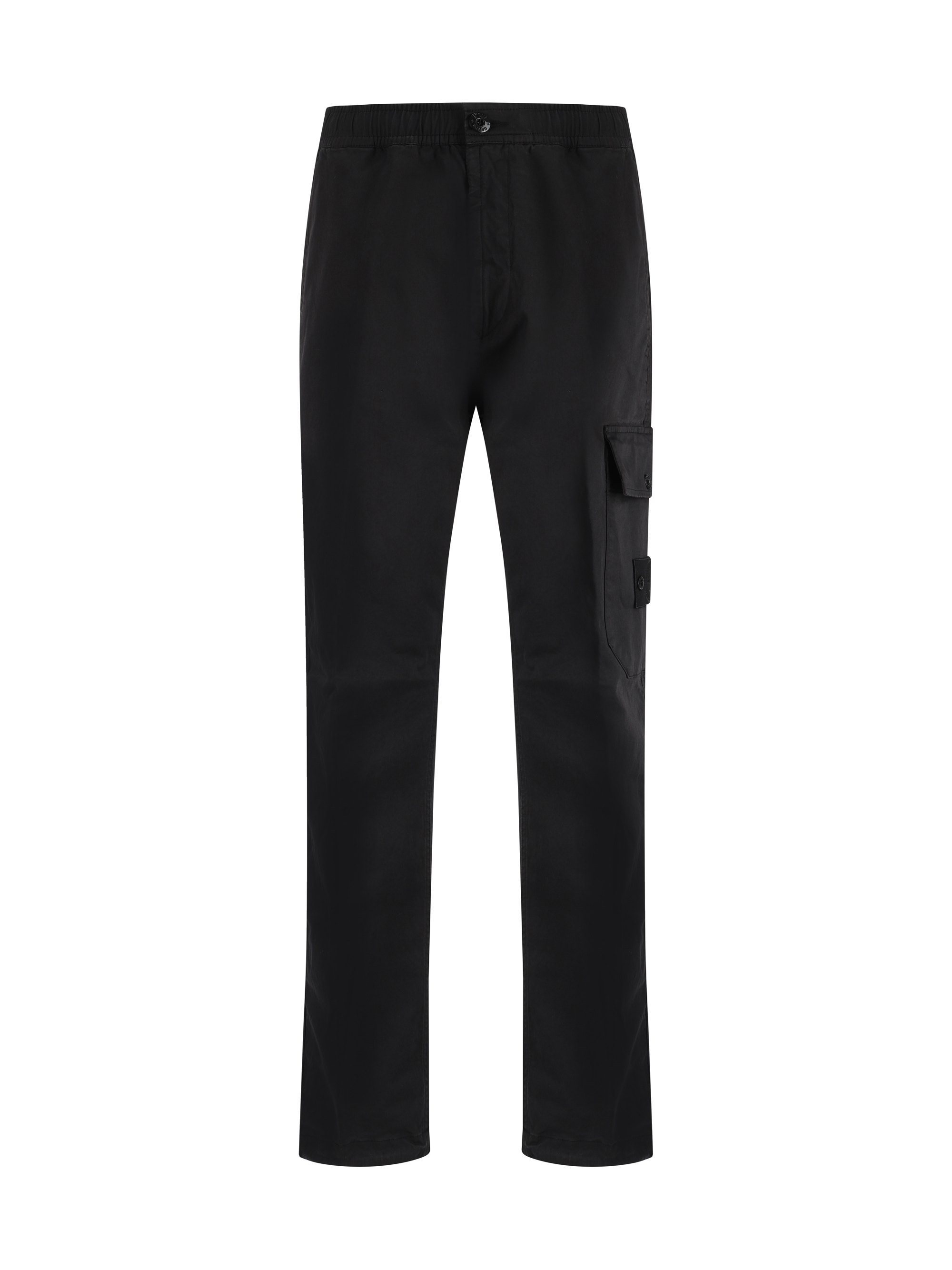 Cotton Ghost Pants by Stone Island featuring an elasticized waistband, a front zipper and button closure, two side welt pockets, a back slit pocket, a cargo pocket with a flap and iconic brand monogram patch on the side panel, a monochrome pattern, and a regular fit.