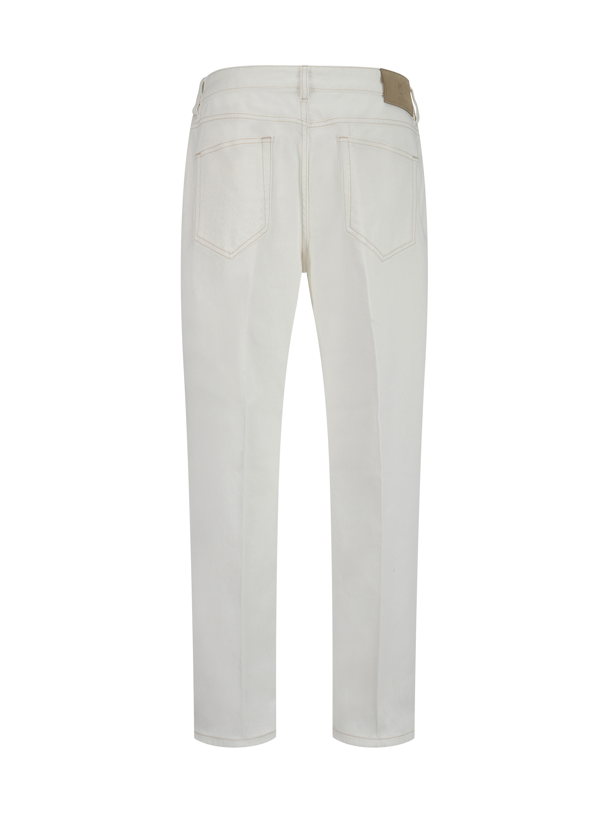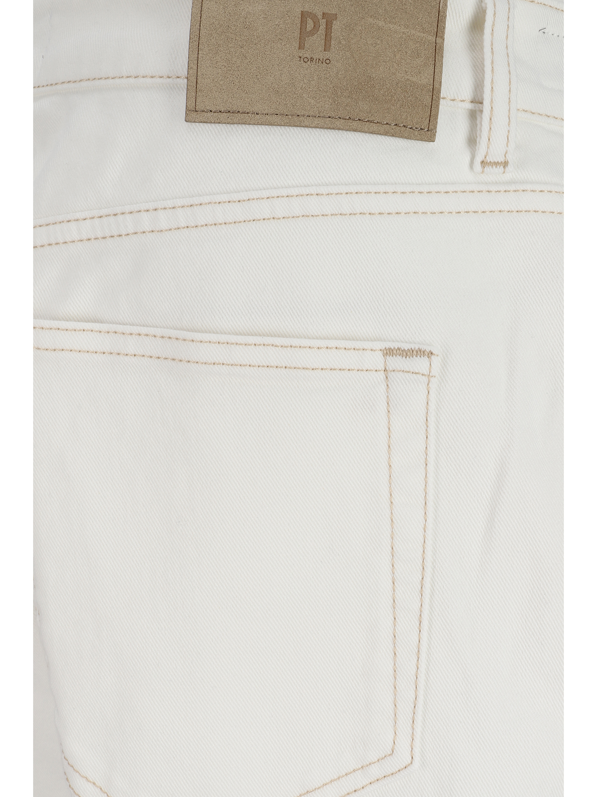 Cotton Denim Pants by Pt Torino, five-pocket straight style, front button closure, belt loops waistband, iconic leather patch with brand signature pressure-printed applique on back.