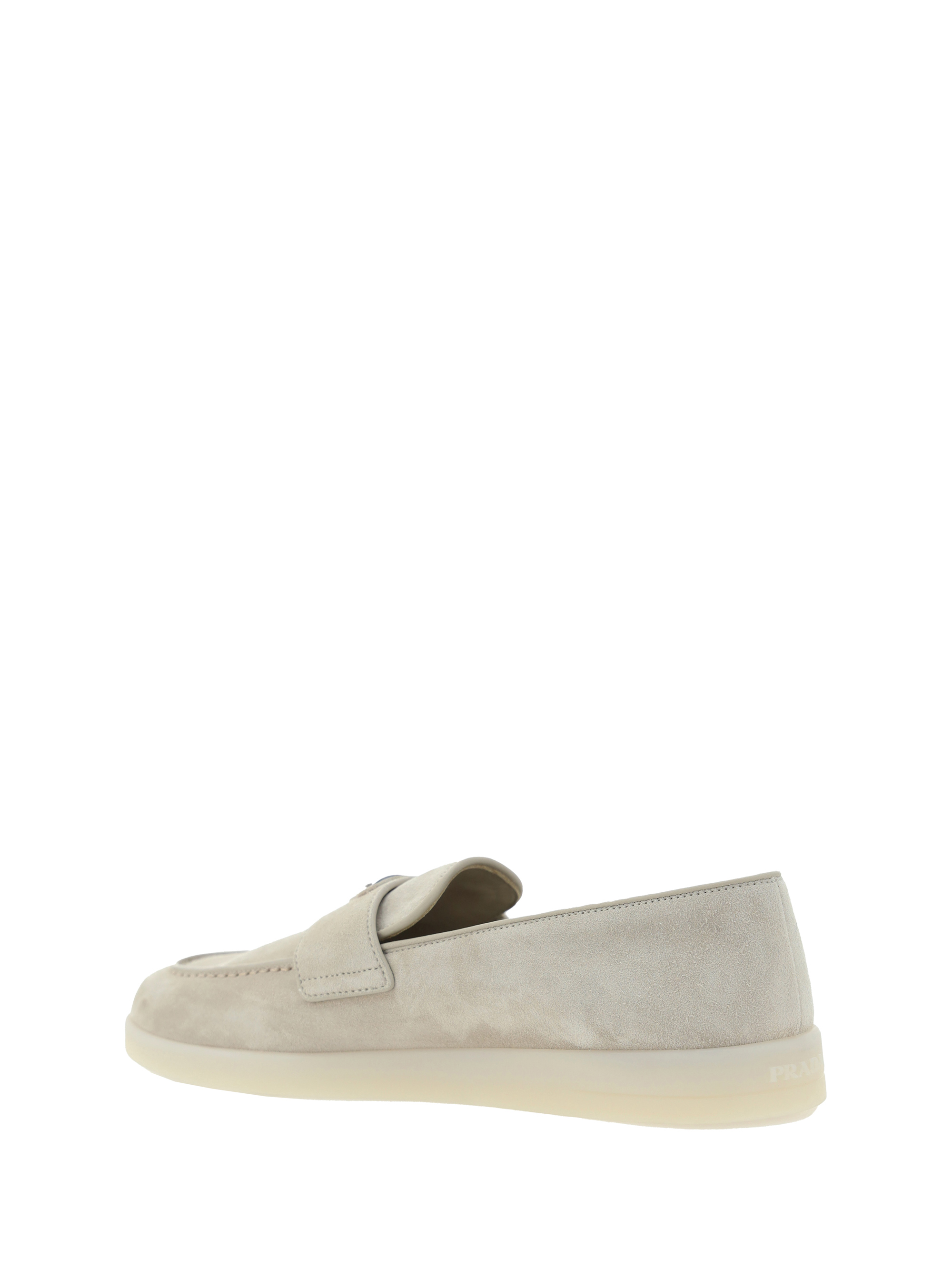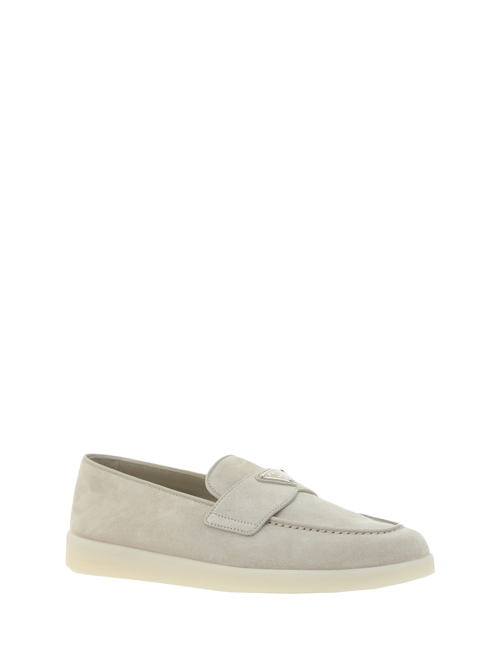 Calfskin Saint Tropez Loafers by Prada, suede leather design, almond toe, enameled plaque with iconic brand signature on front, contrasting rubber sole.