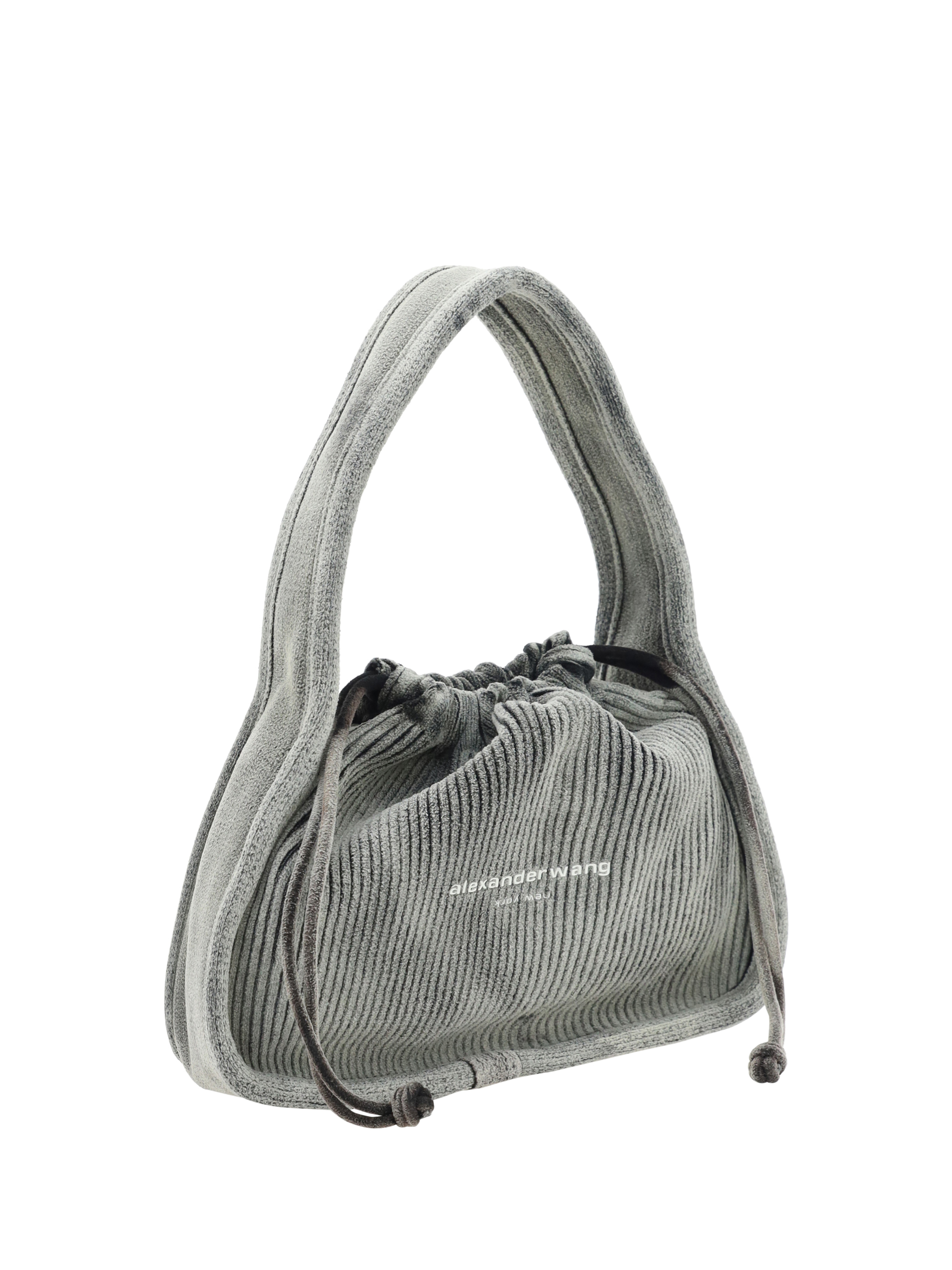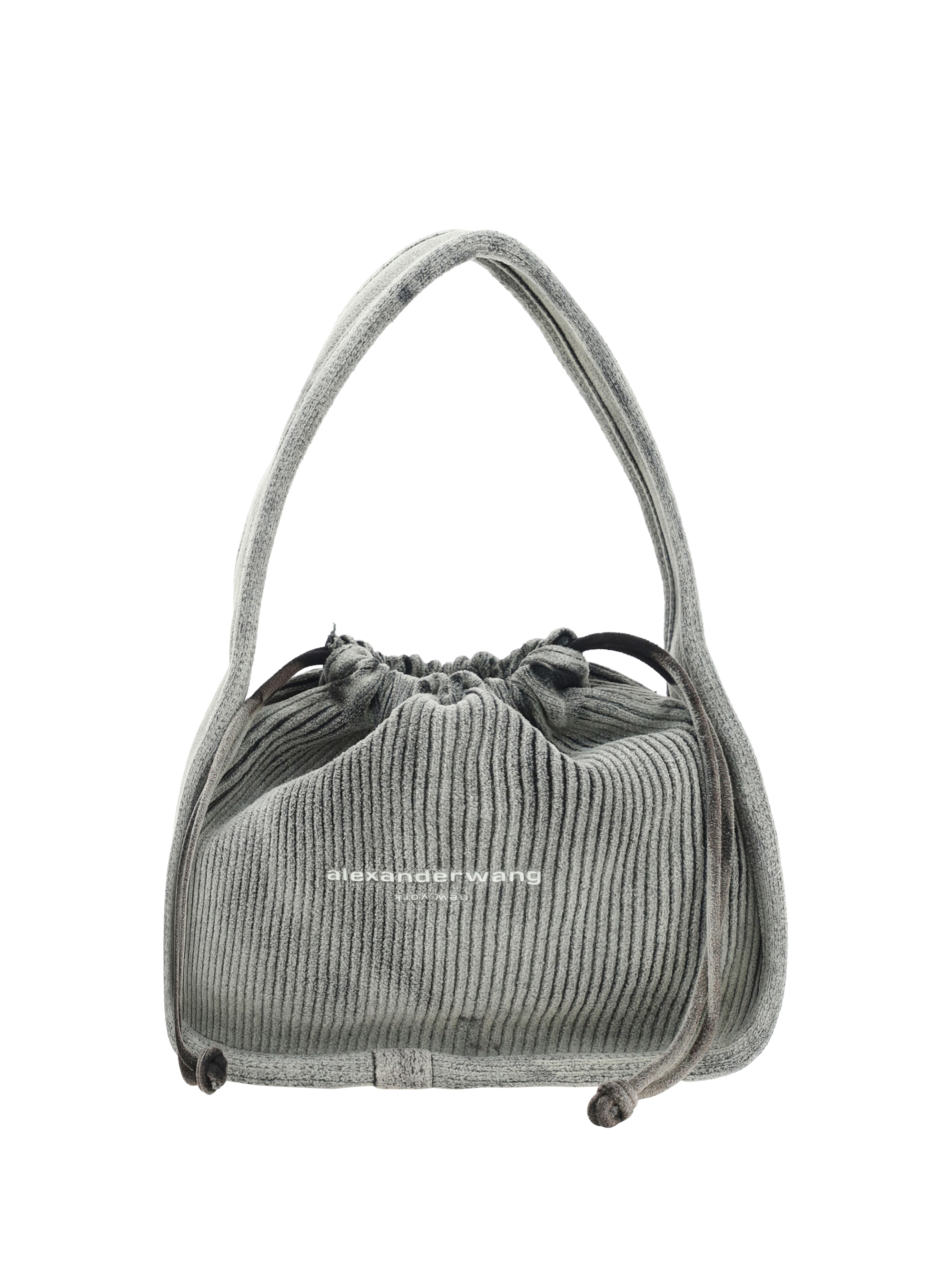Ryan Small Shoulder Bag by Alexander Wang, a flat top handle, drawstring top closure with ribbons, ribbed design, iconic brand monogram printed on the front.