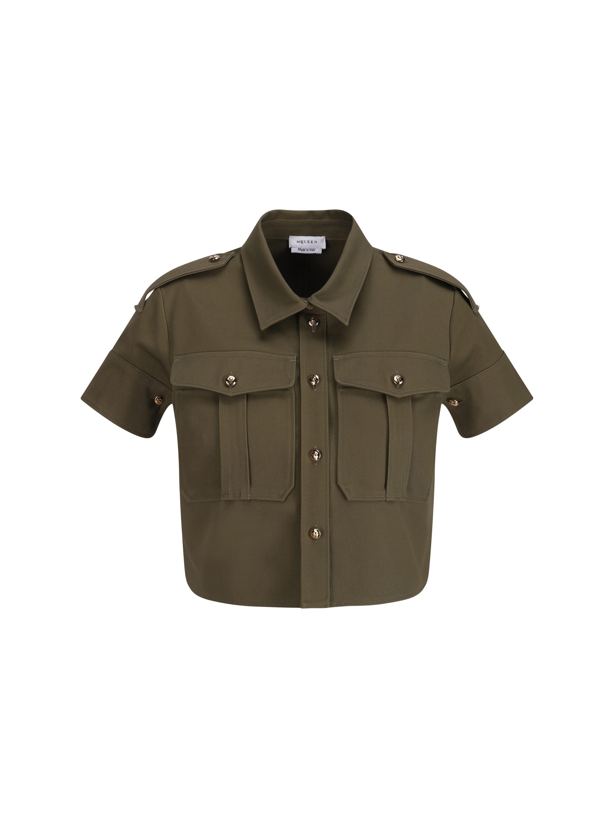 Cotton Jacket by Alexander Mcqueen, cropped pattern with short sleeves, classic collar, front button closure, two front patch pockets with button-fastening flap, monochrome pattern, fitted fit.
