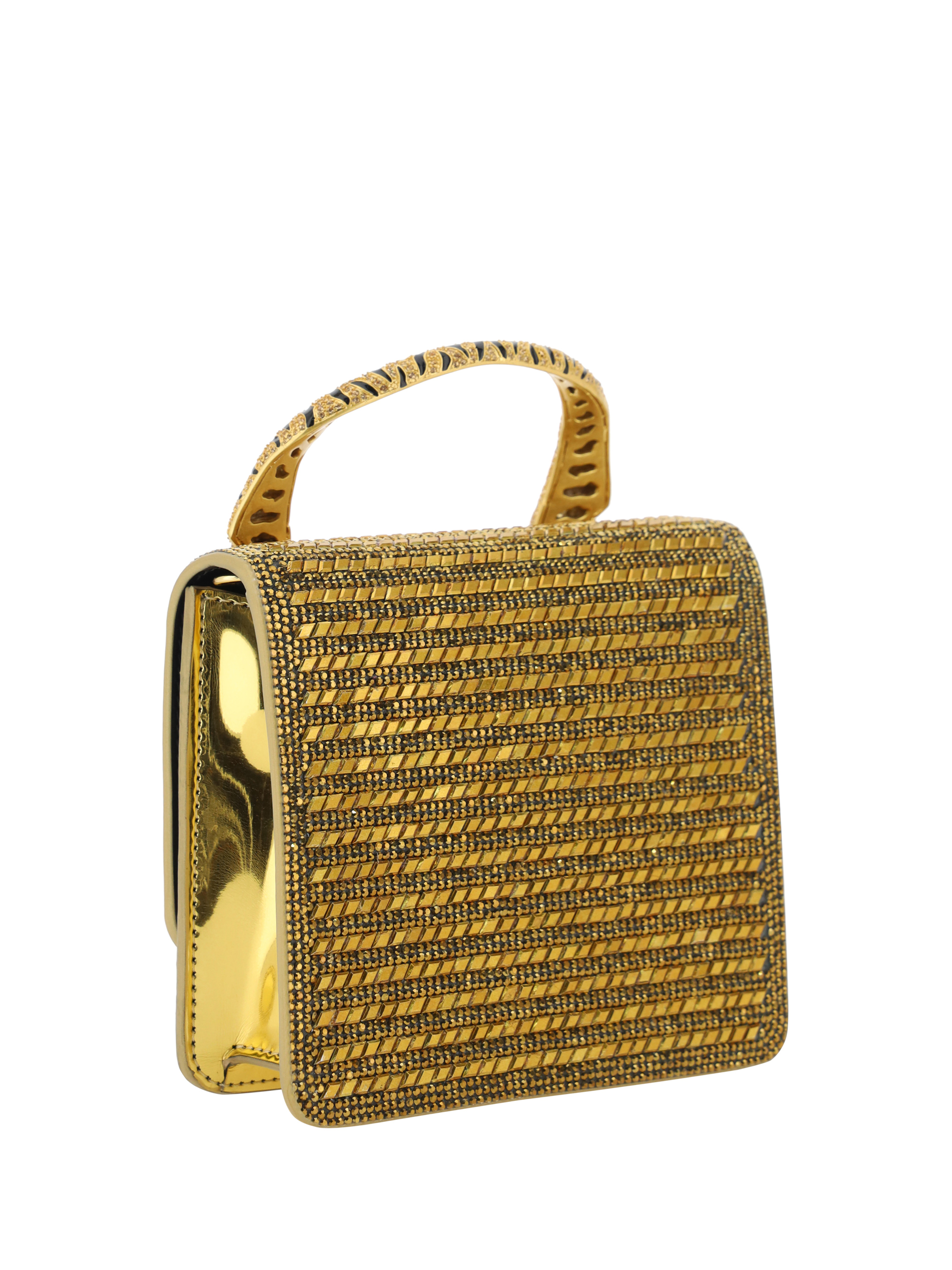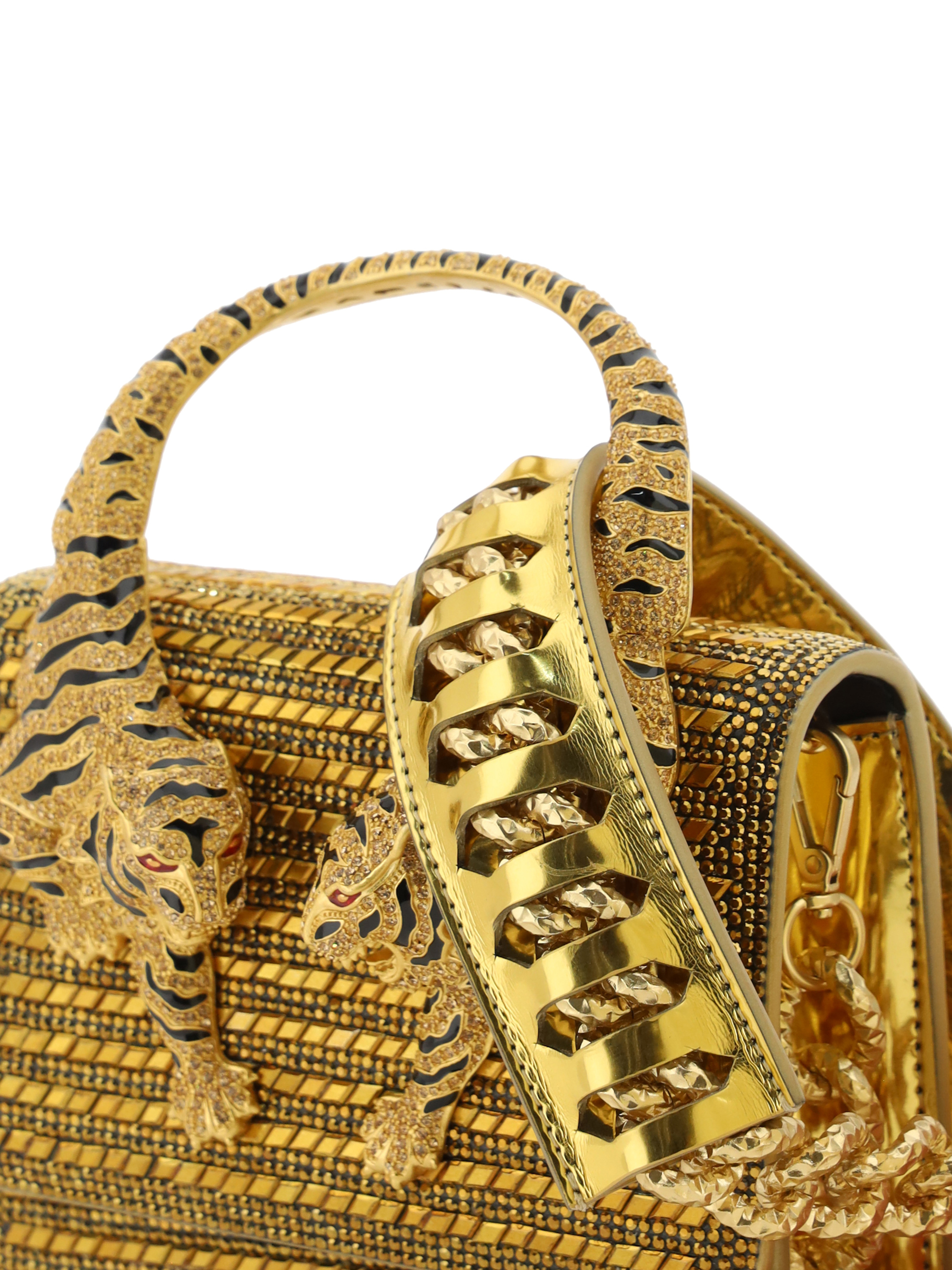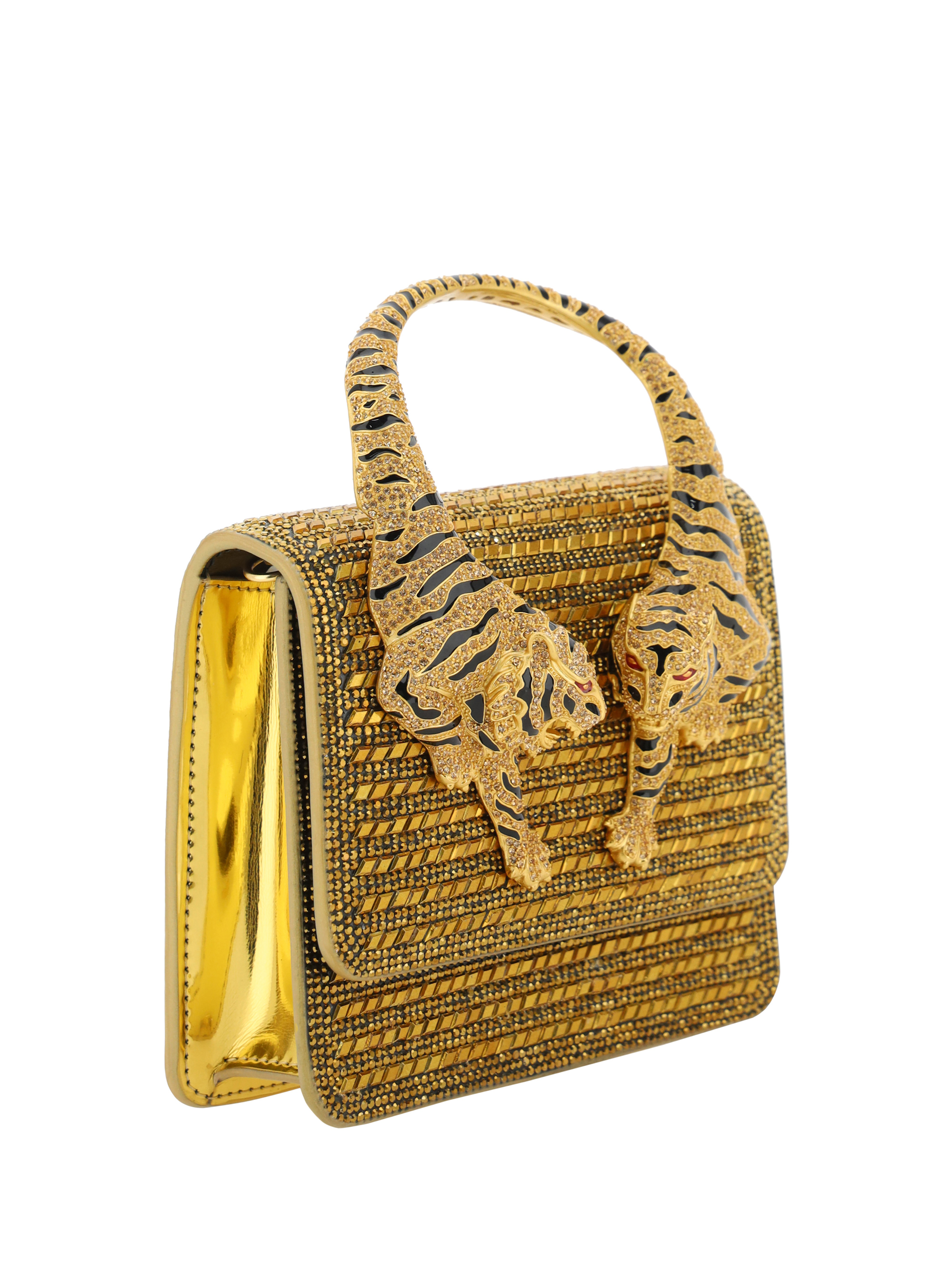 Leather Handbag by Roberto Cavalli, adjustable and removable chain shoulder strap, front closure by magnetic flap, jeweled handle representing two joining tigers, design with shiny jewel details and all-over applied rhinestones.