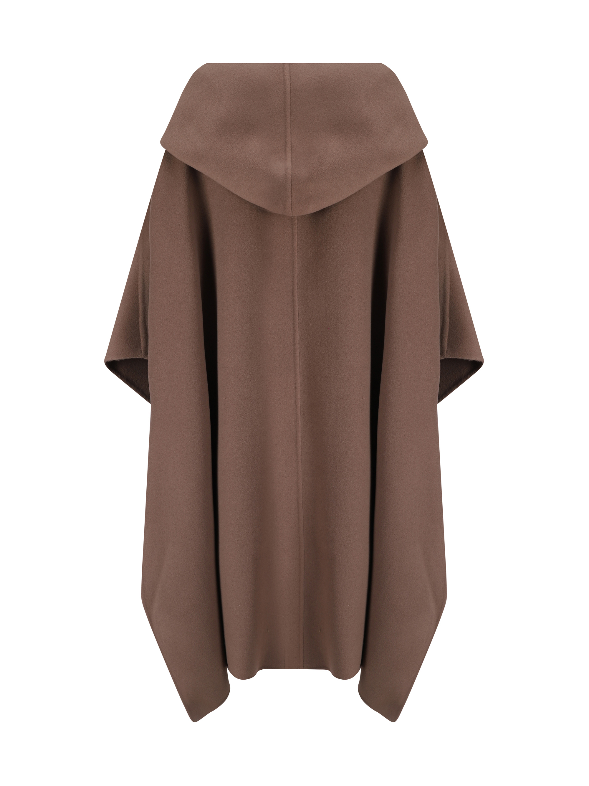 Virgin Wool Eve Hood Coat Cape by Gianluca Capannolo, cape style, hood, hook-and-eye closure, single-color pattern.