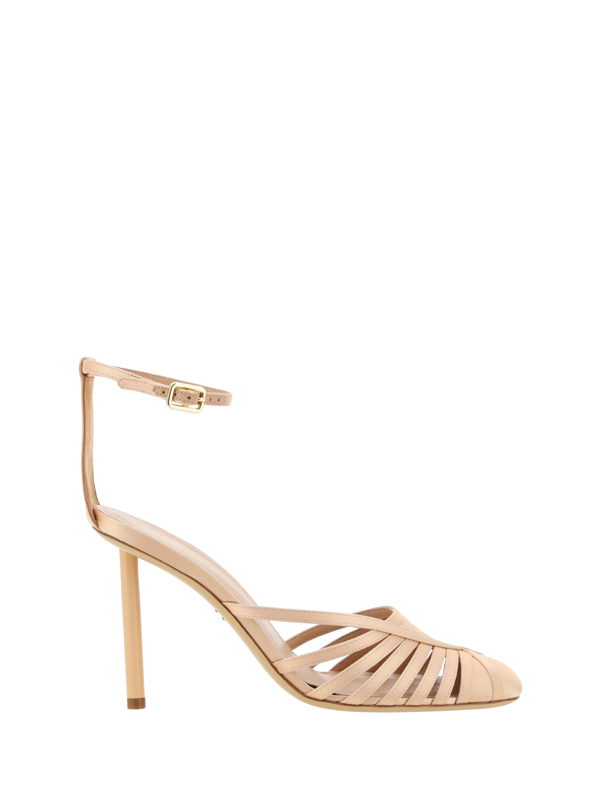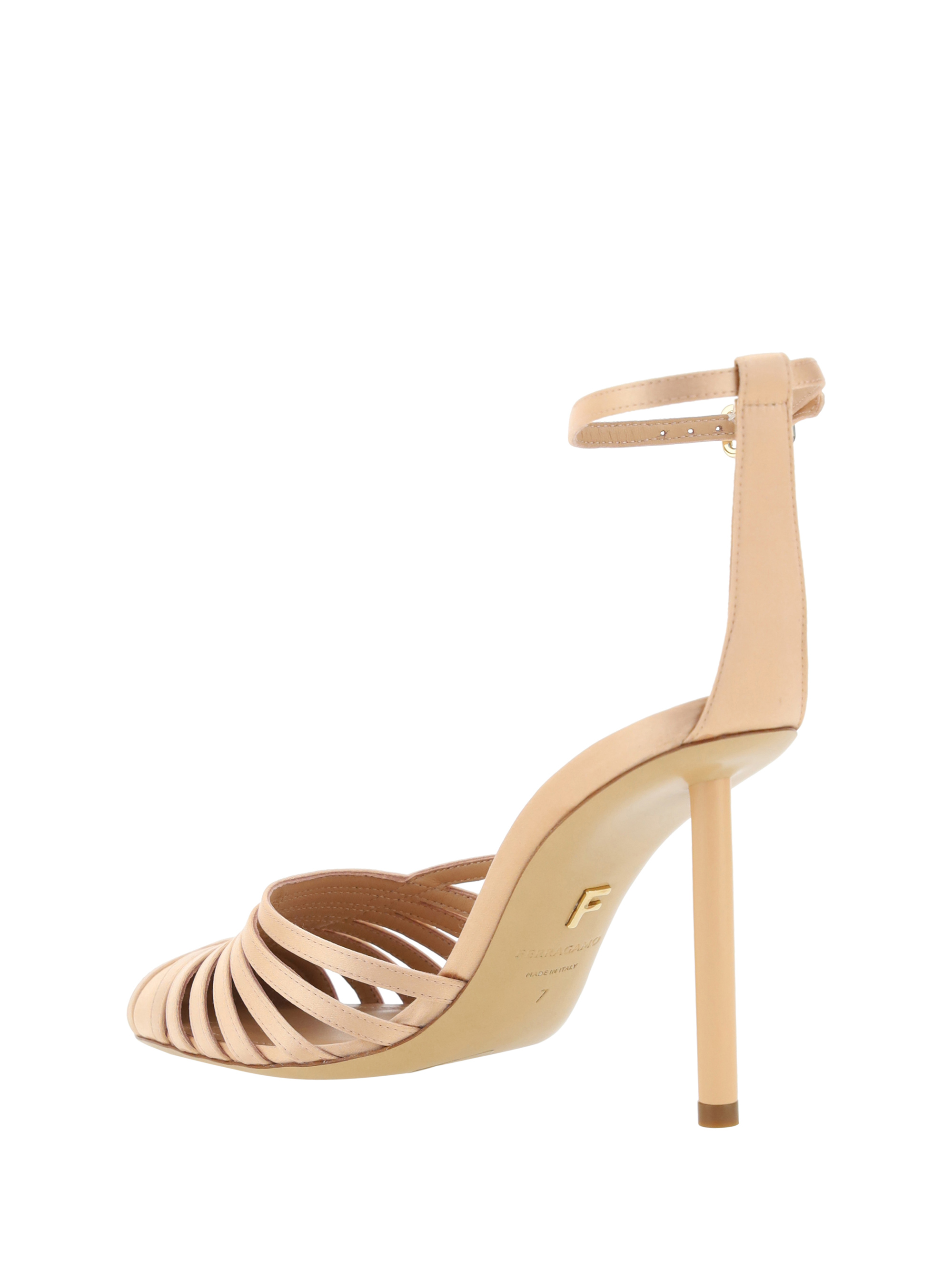 Pumps by Ferragamo, almond toe, adjustable ankle lap strap closure, satin design, patent stiletto heel, cage design with shiny satin straps, logoed insole.