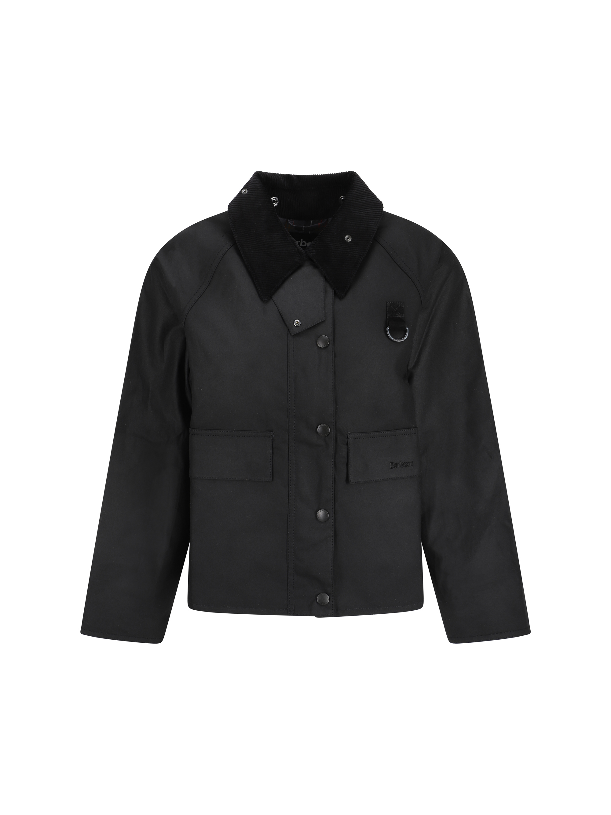 Spey Wax Down Jacket by Barbour, front closure with double-slider zipper and snap buttons, iconic corduroy collar, two front welt flap pockets, iconic brand monogram on front, iconic waxed design.