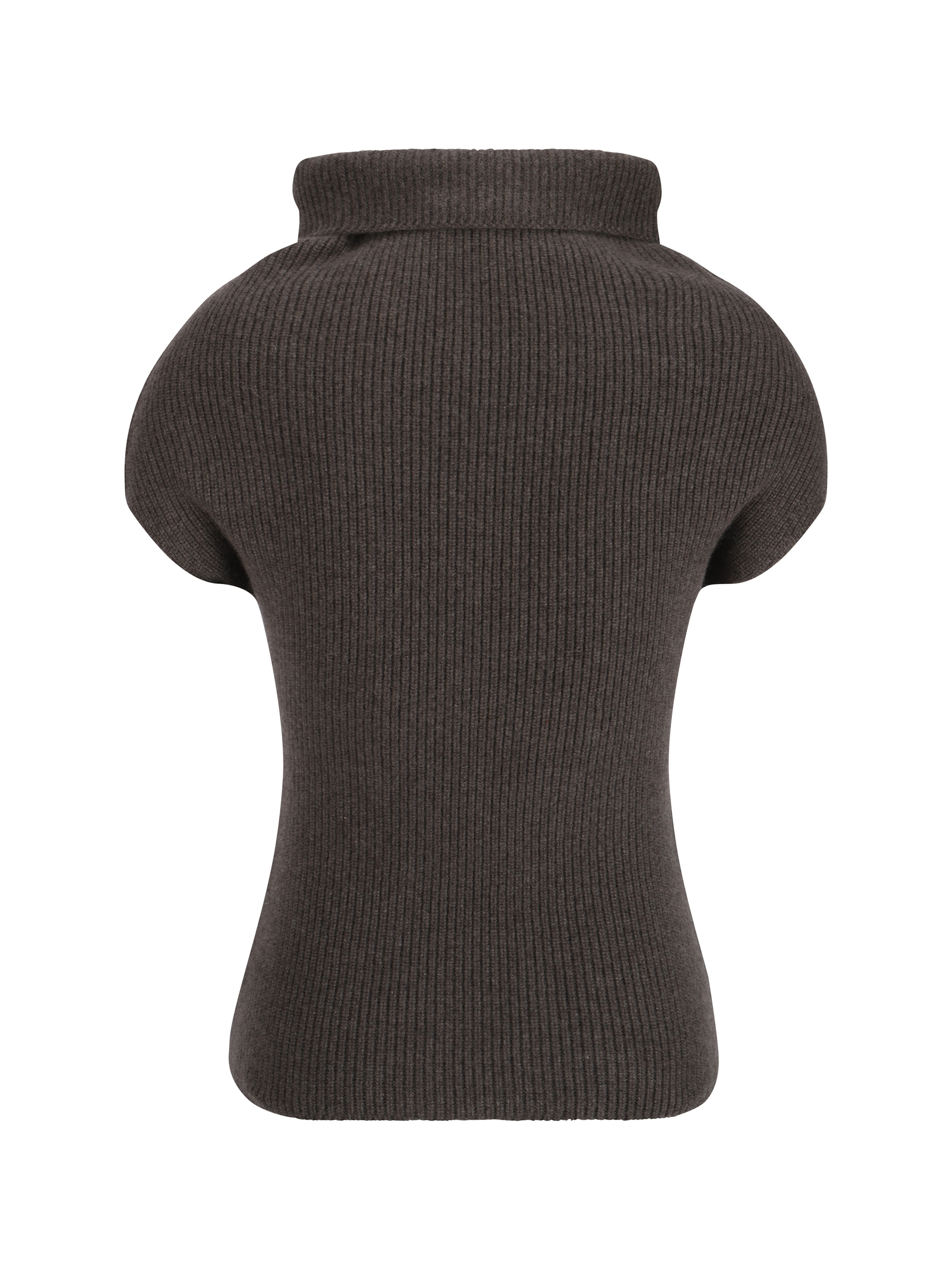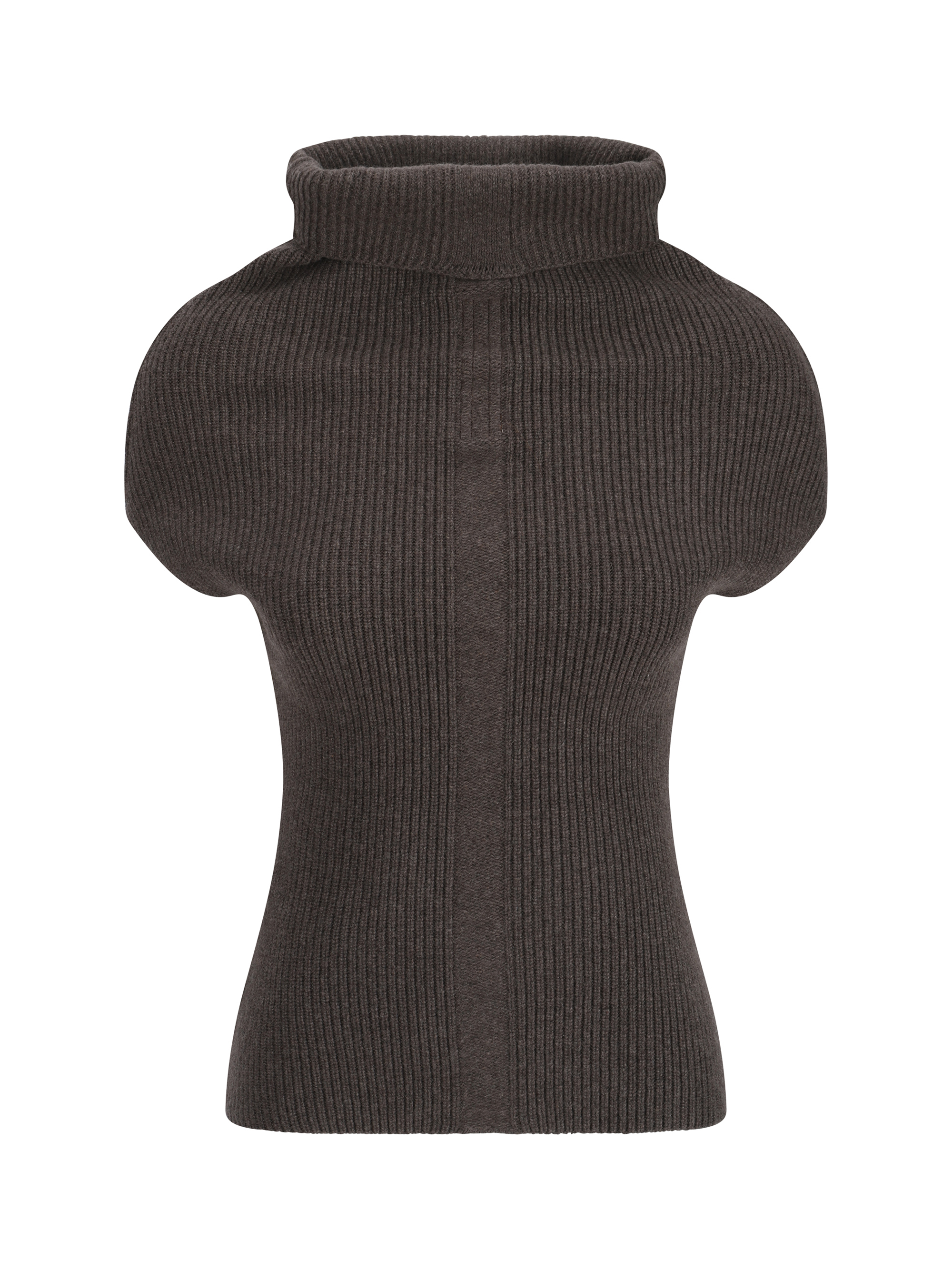 Wool vest by Rick Owens, ribbed pattern, fitted waist, high collar from the shoulders up.