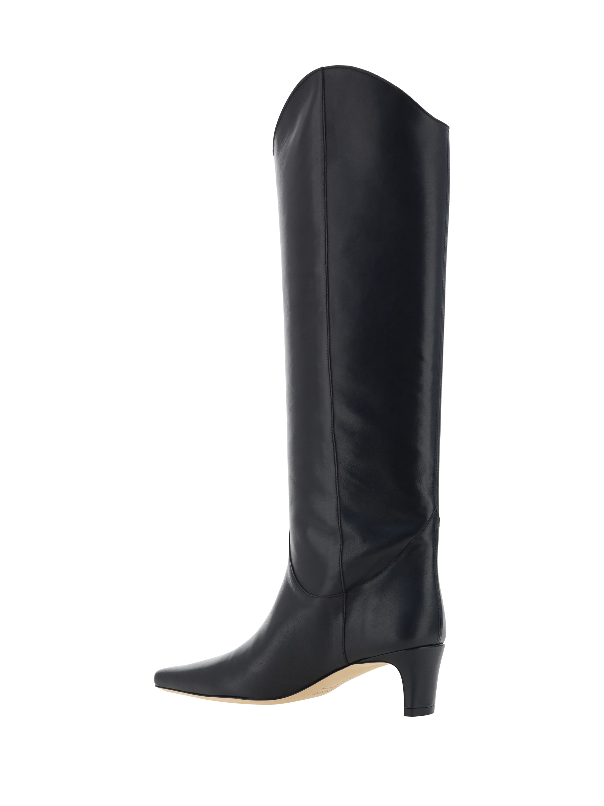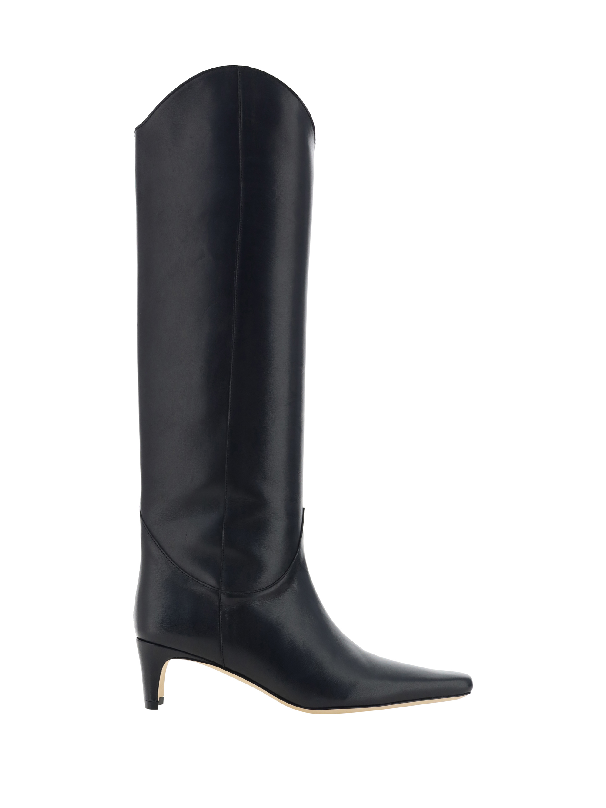 Leather Western Wally Boots by Staud, knee-high pattern, leather block heel, extended toe, monochrome design.