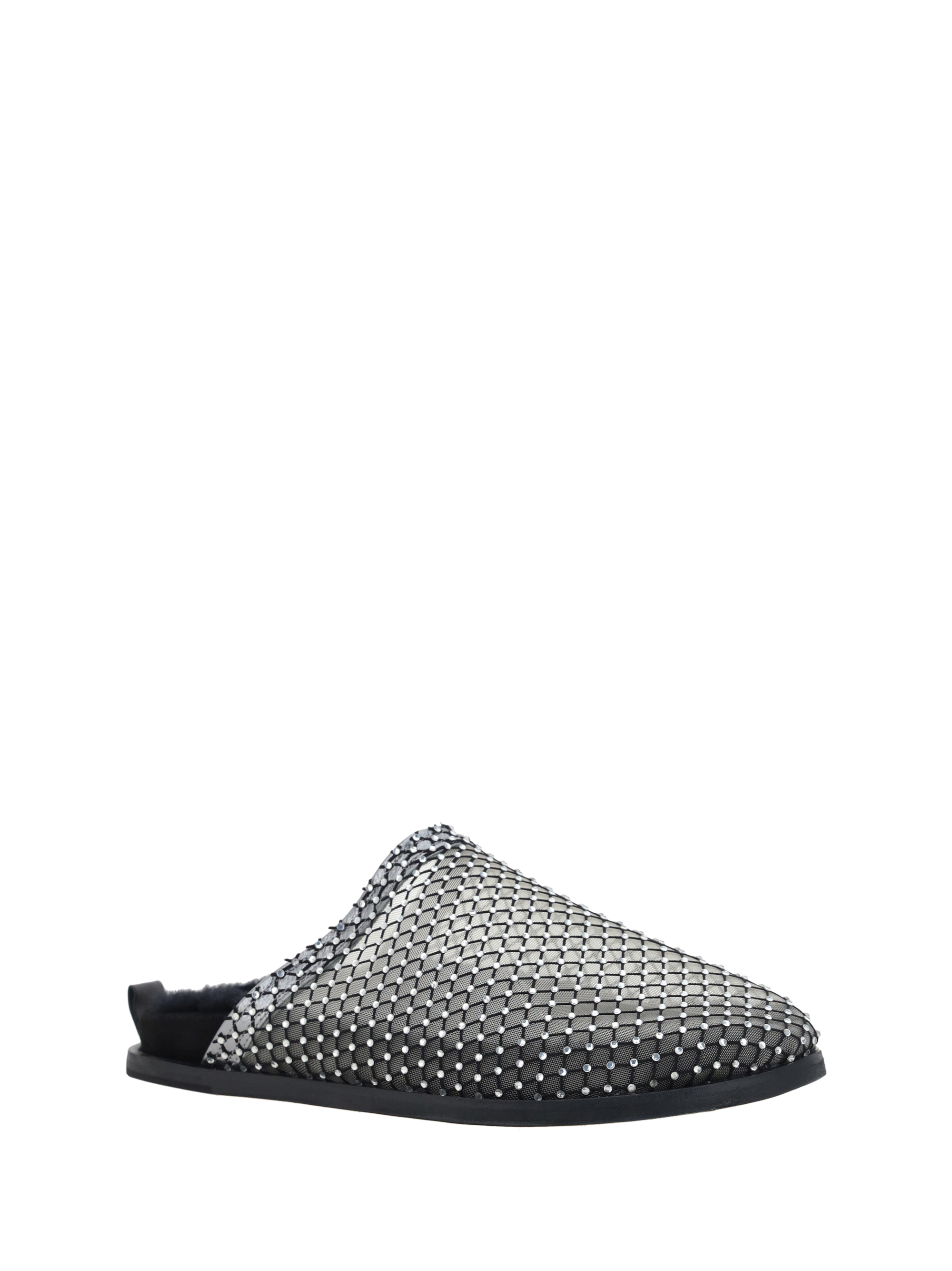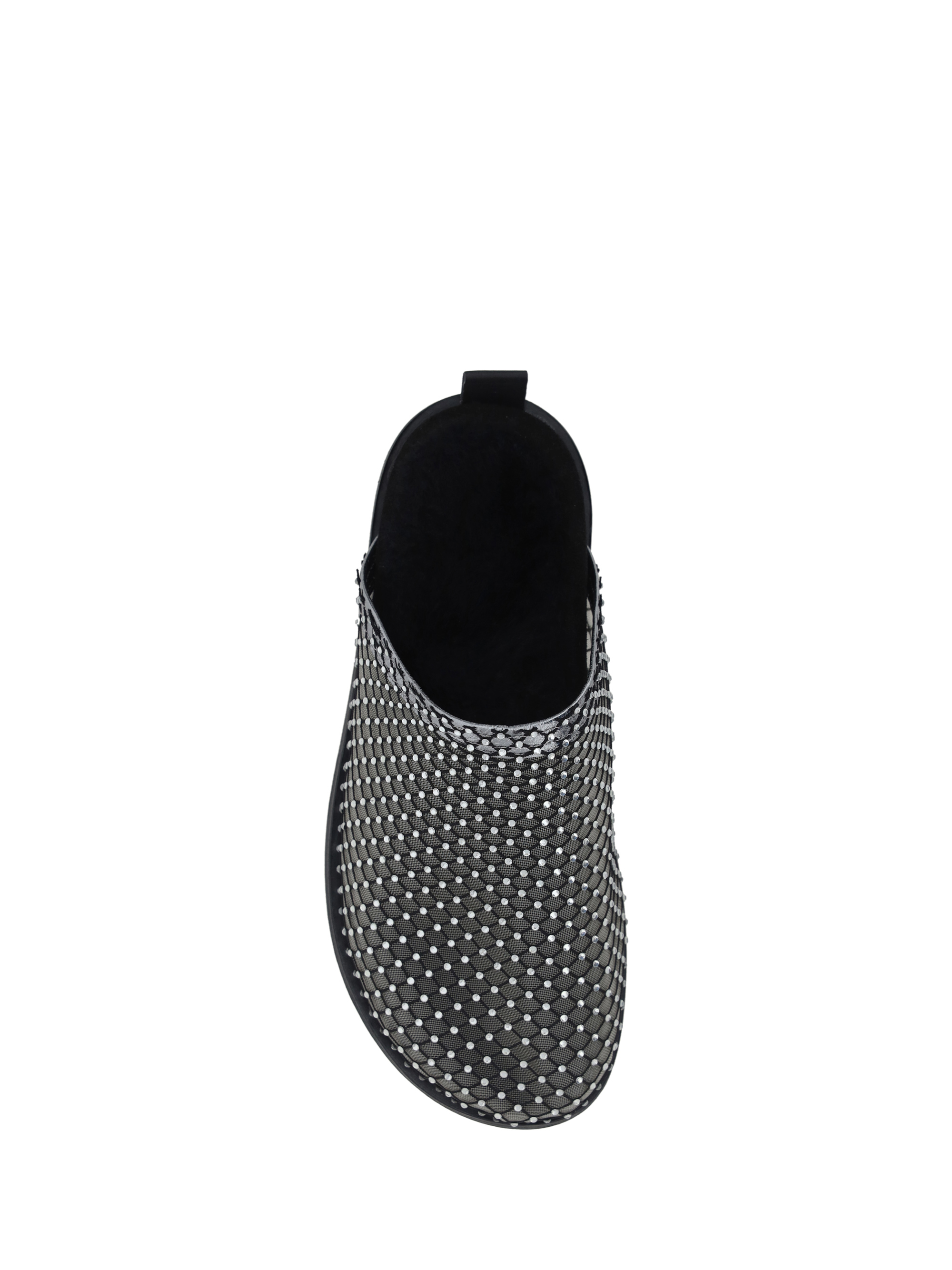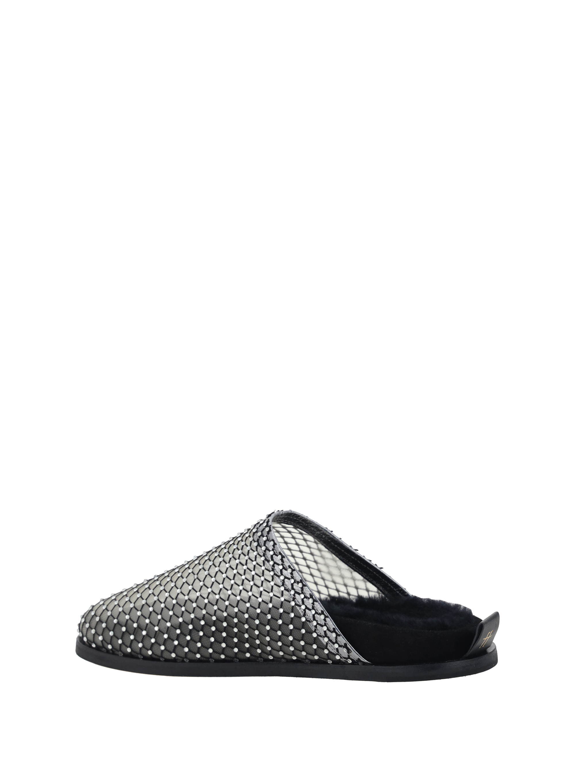 Sabot by Forte_Forte, round toe, flat sole, technical mesh upper doubled with overlapping rhinestone mesh, fur-lined and contoured insole with natural leather bottom and open channel, pull tab for easy on and off fit.