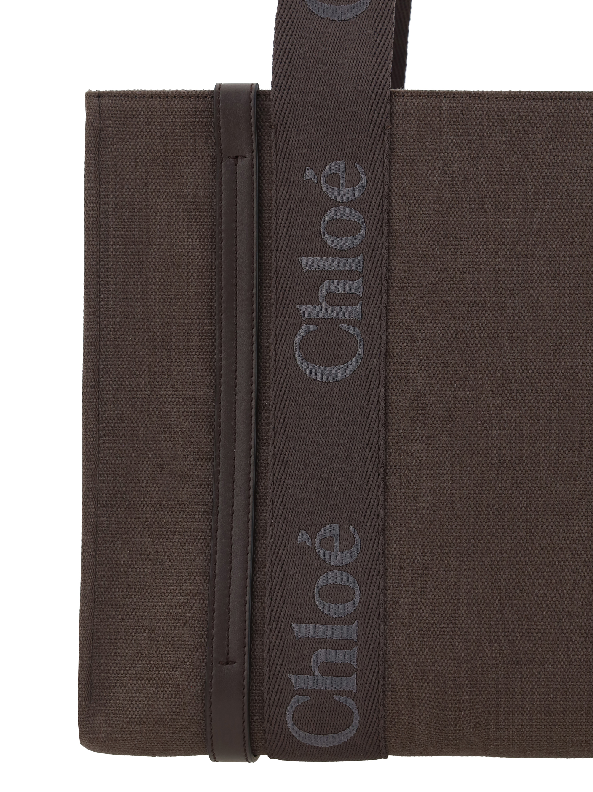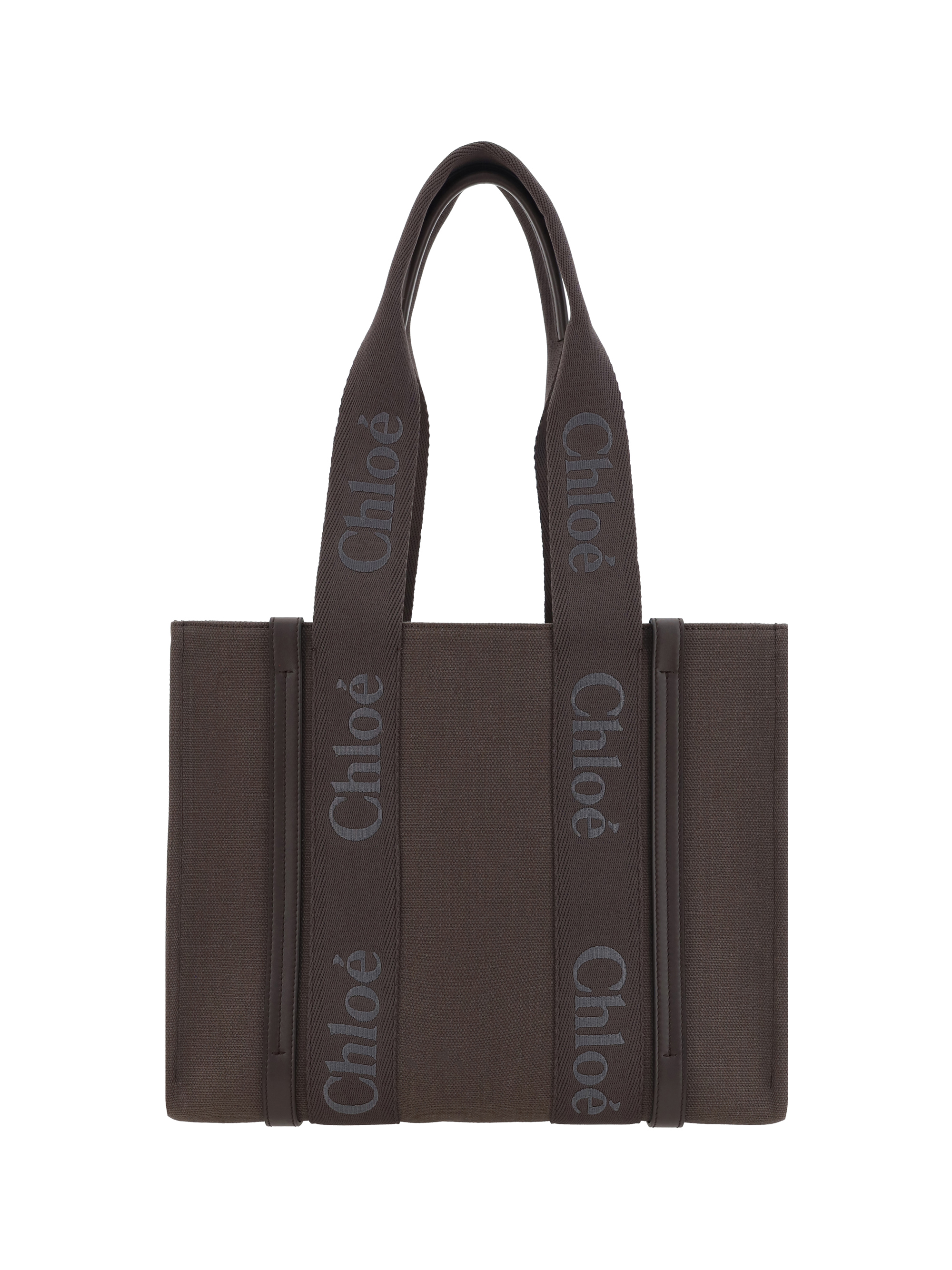 Woody Linen Hand Bag by Chloe, double flat handles with extension at side panels, iconic brand monogram, contrasting leather details, interior welt pocket, interior closure by concealed magnetic button.