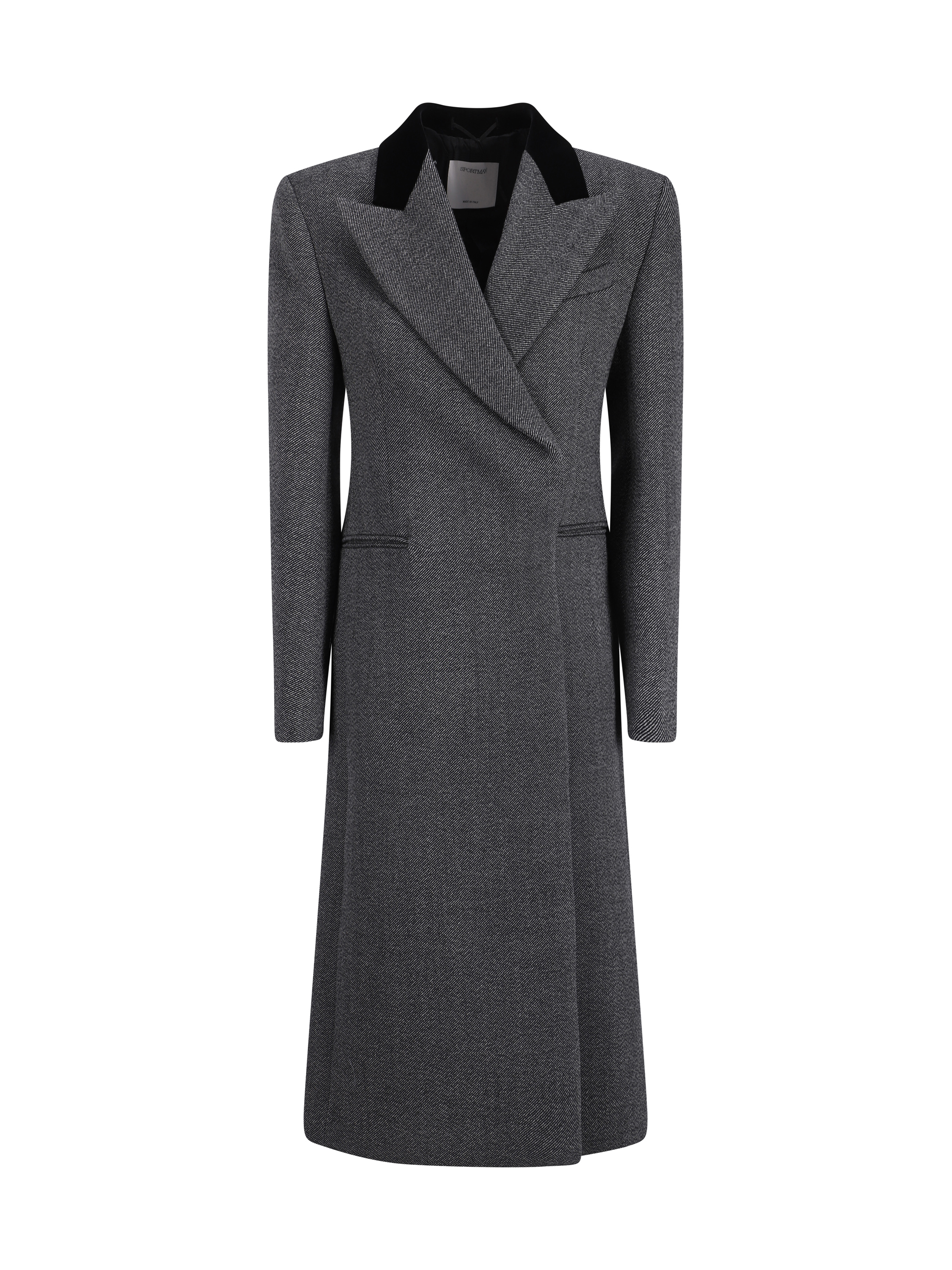 Wool Liuto Coat by Max Mara Sportmax, foot length, spear lapels with velvet detail, front closure via two front welt pockets, one flap pocket on front, one back slit, all-over melange pattern, over fit.