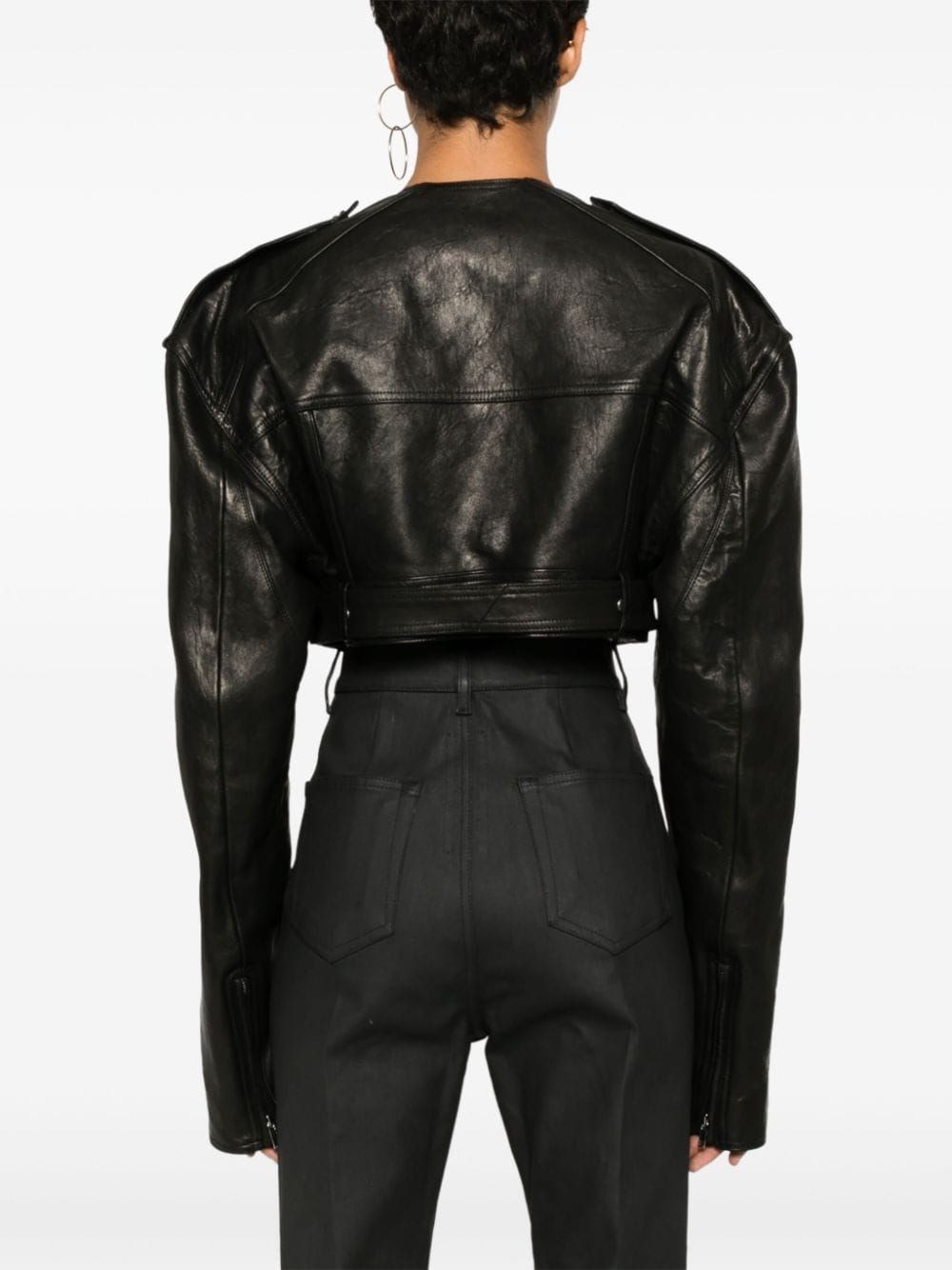 SKU B4506236 Short biker jacket in black nappa leather from Rick Owens, with dropped shoulder, long sleeves with zip, removable belt. COD. RP02D3705009