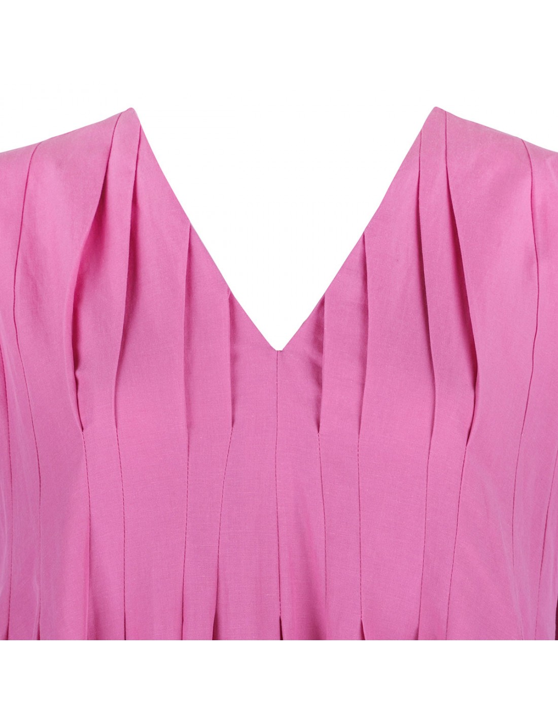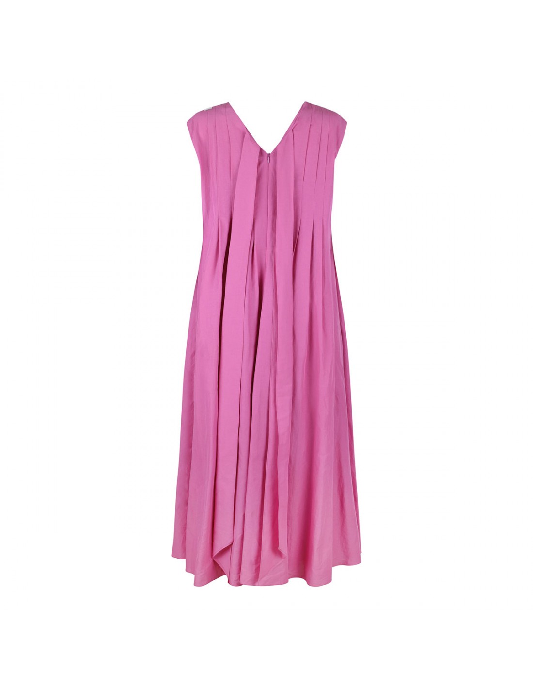 Pink cotton and ramie Piega dress from 'S Max Mara featuring sleeveless style, flared silhouette, flat pleats on the bodice and waist, V-neck at the front and back, long ribbons to tie at the back, concealed zip closure.