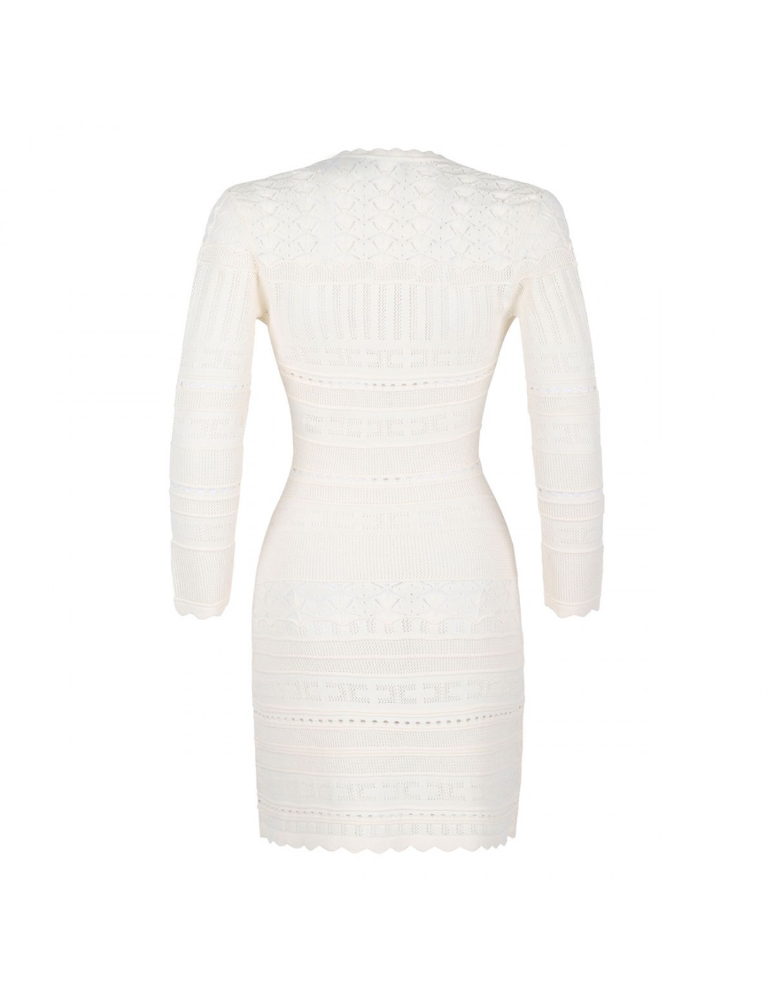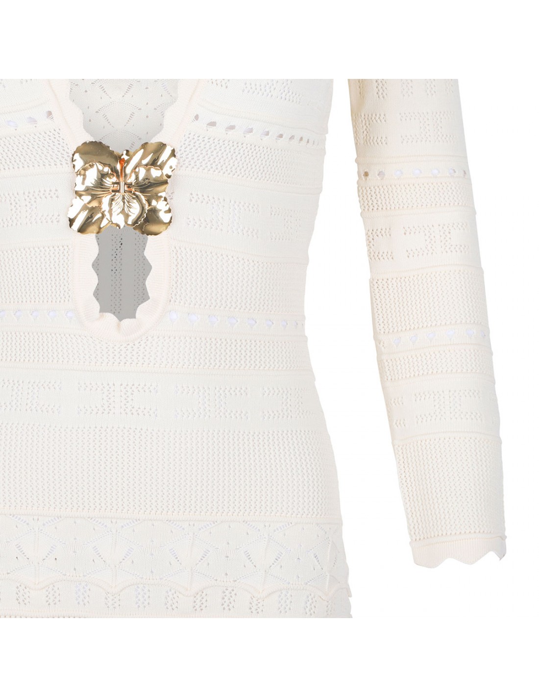 Butter hue openwork knit viscose mini dress from Elisabetta Franchi featuring floral and logo lace motif, golden jewel flower, long sleeves, deep V-neck, slim fit.