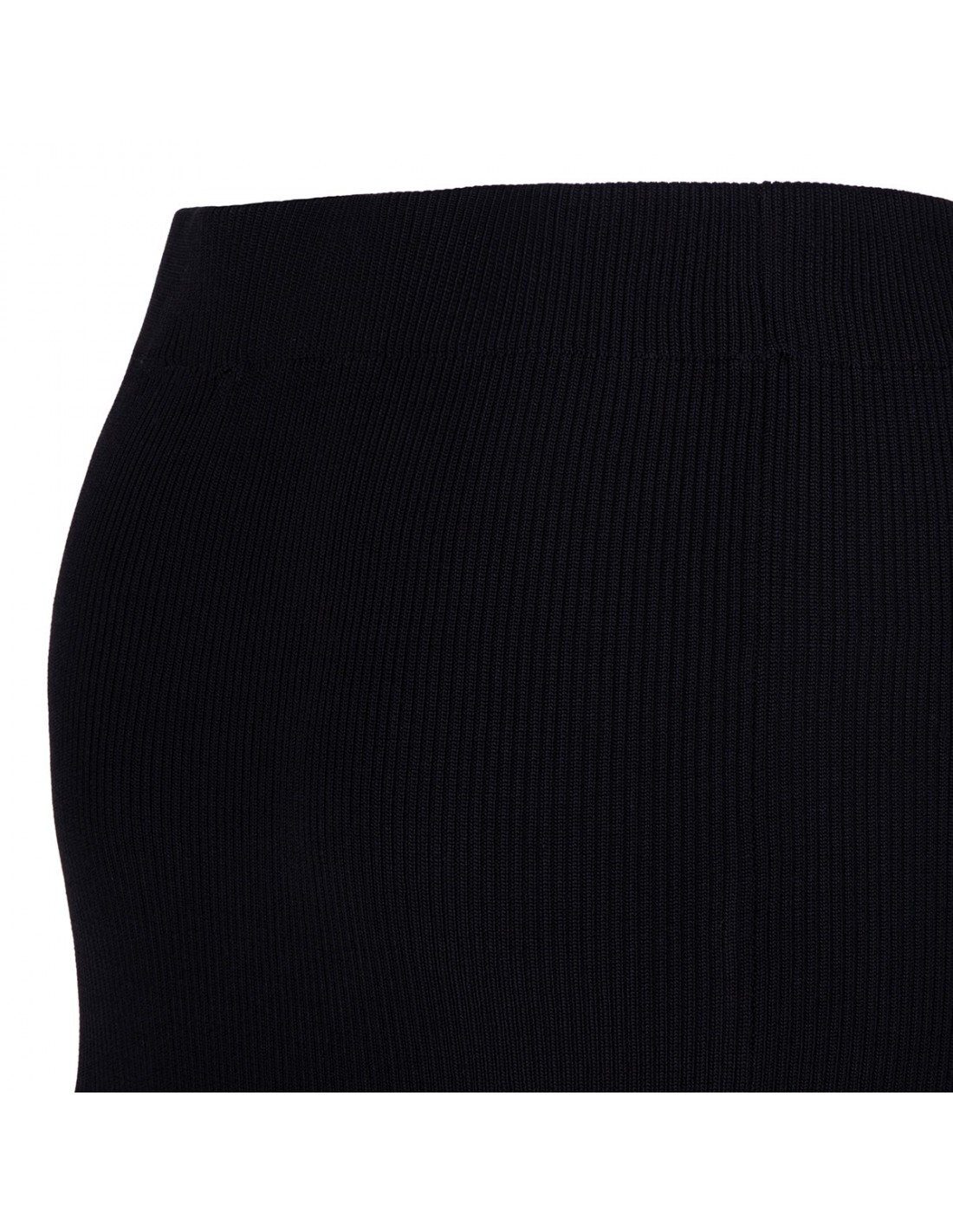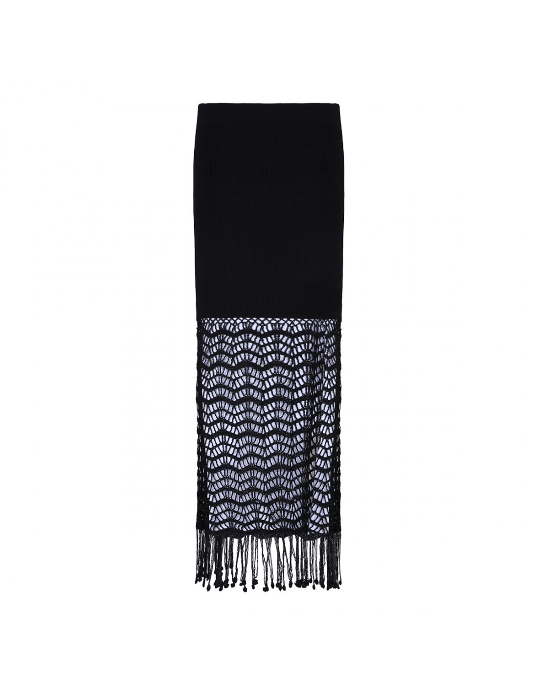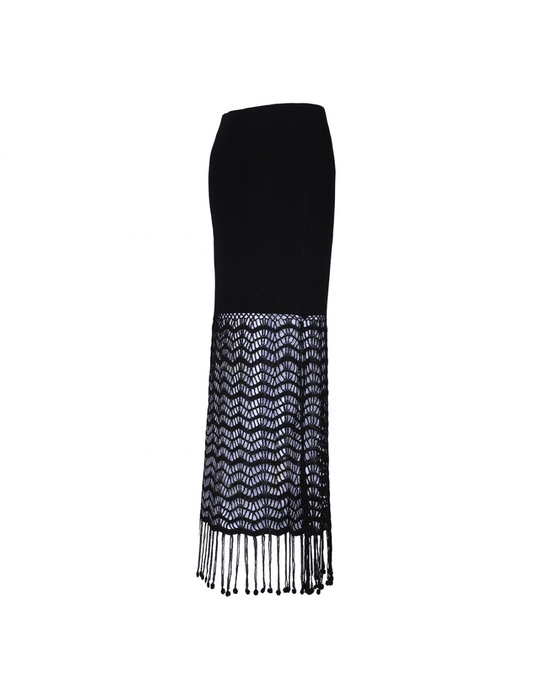 Black shiny viscose crochet skirt from Ganni featuring ribbed waistband, beaded fringe detail, long length.