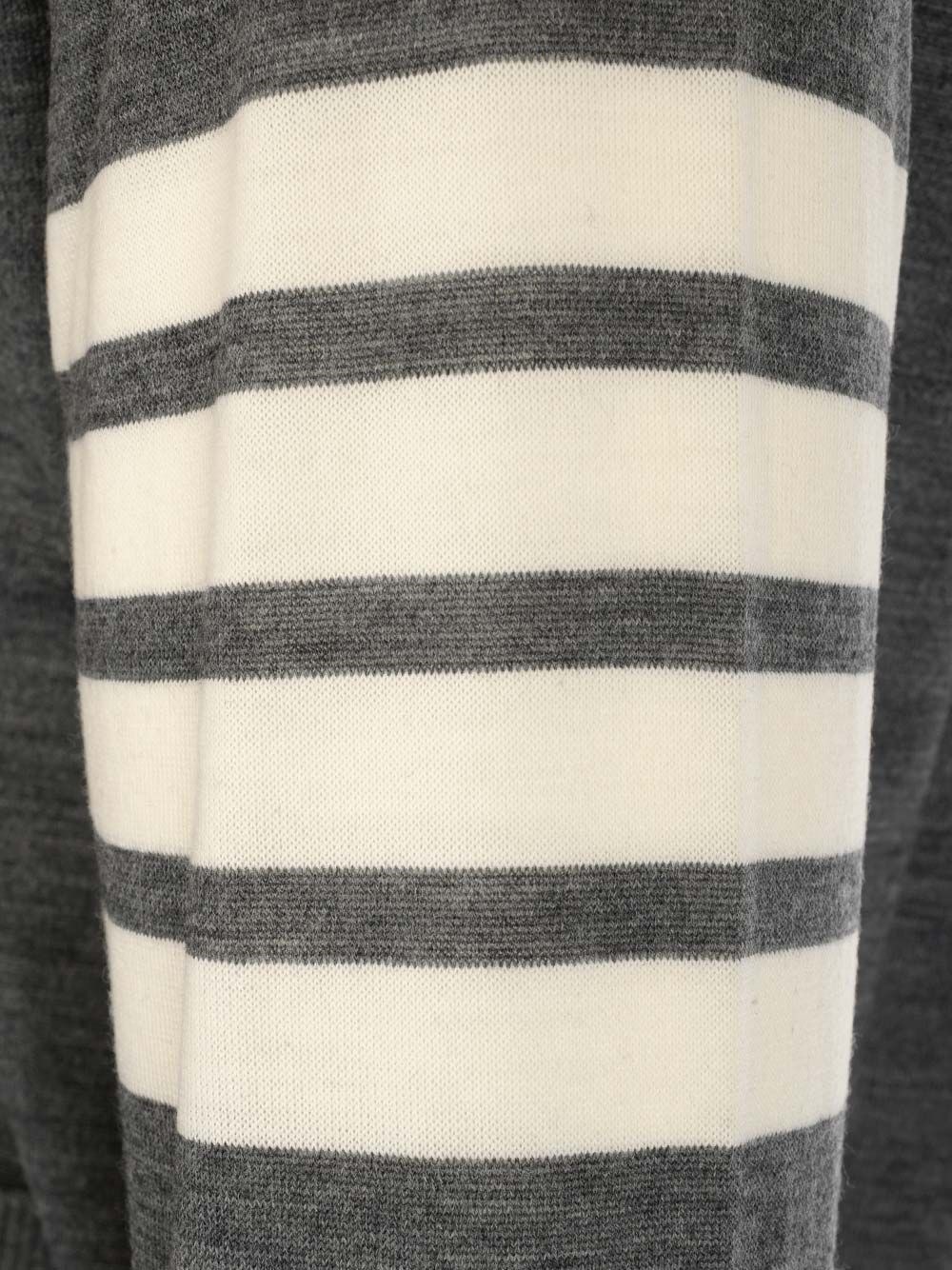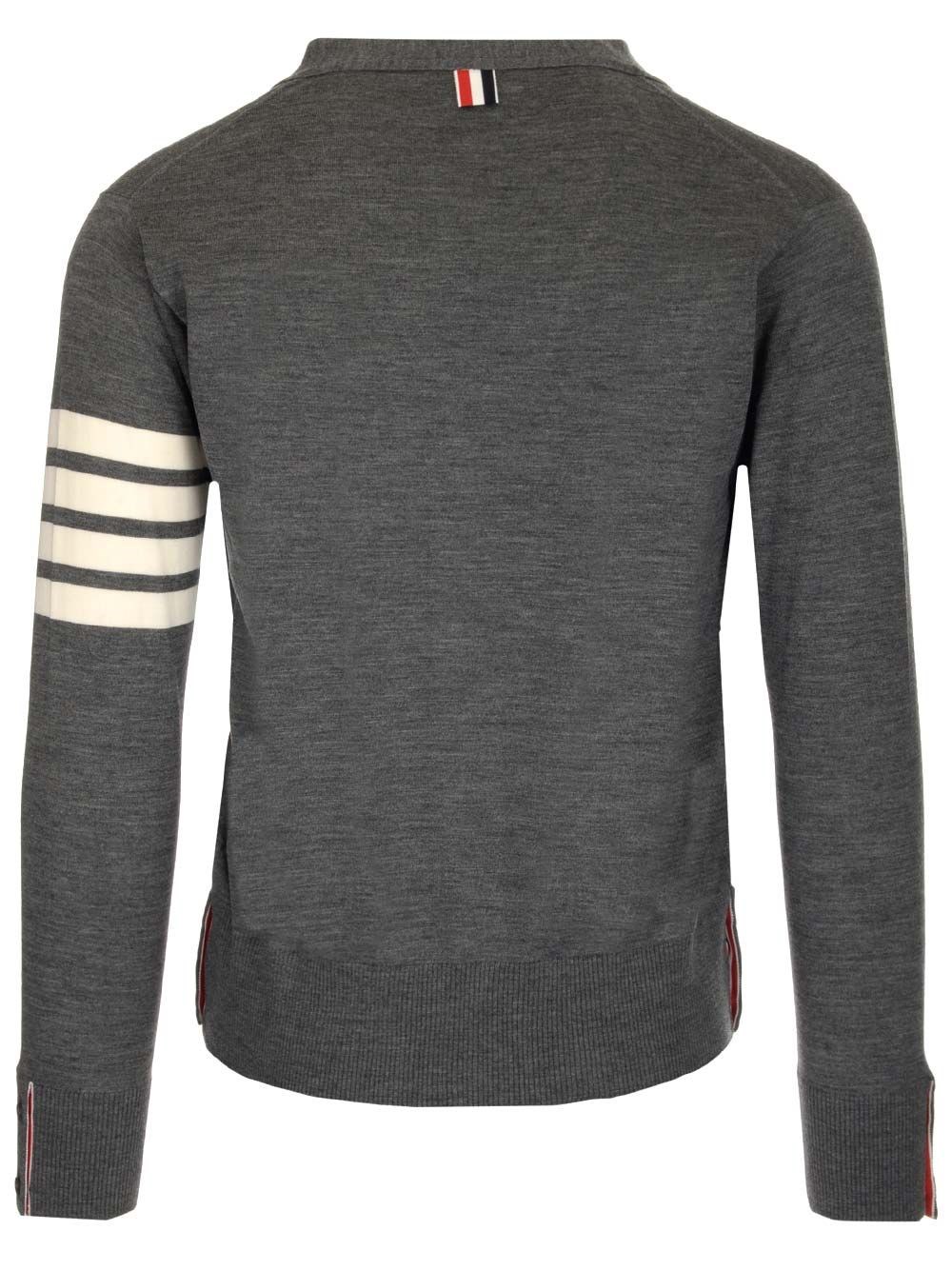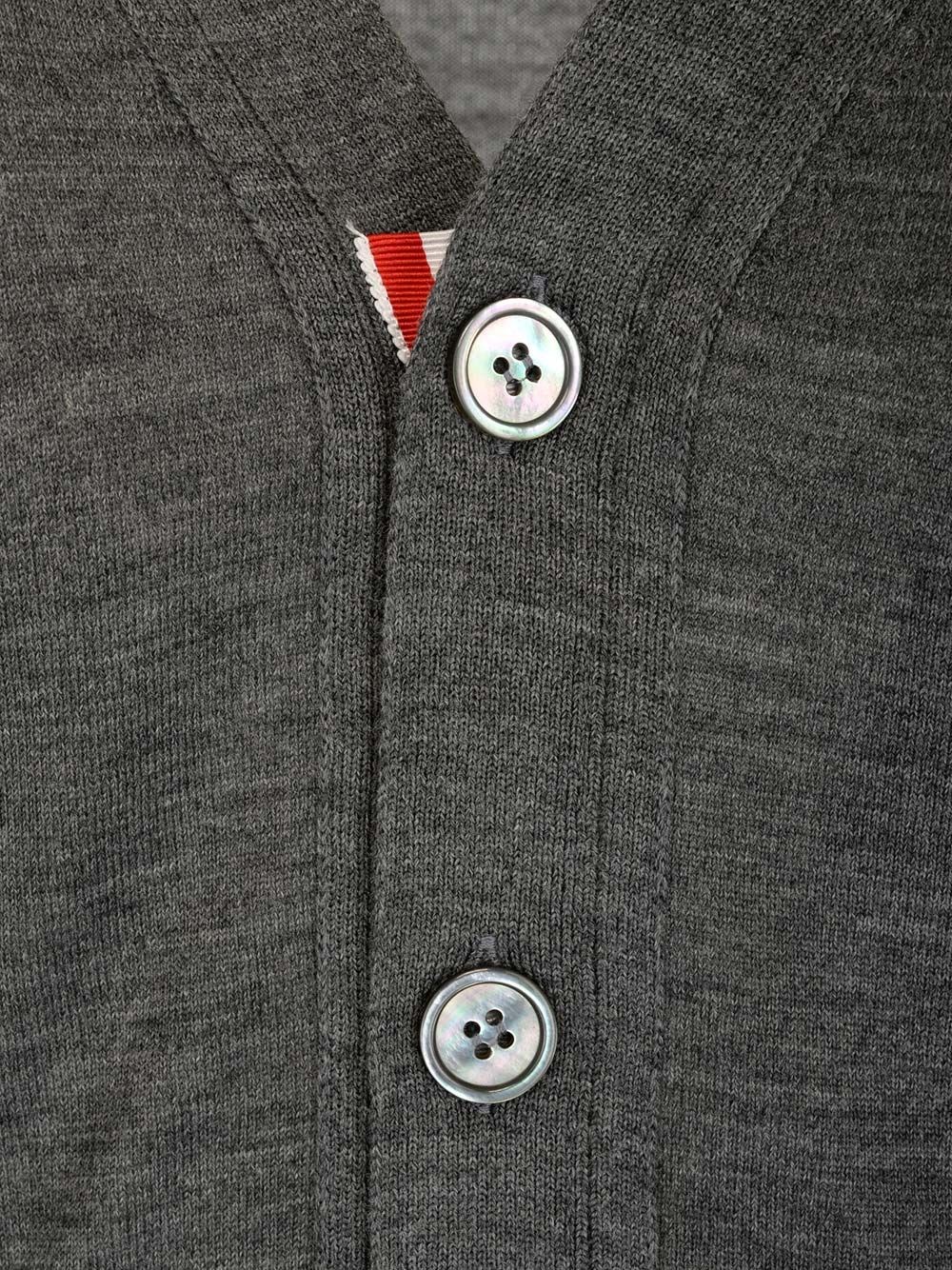 SKU B4500754 Grey cardigan from Thom Browne in merino wool, white 4-bars on one sleeve, v-neck, two front pockets. COD. MKC002A-Y1014038