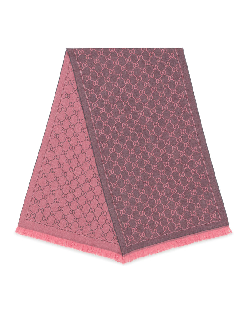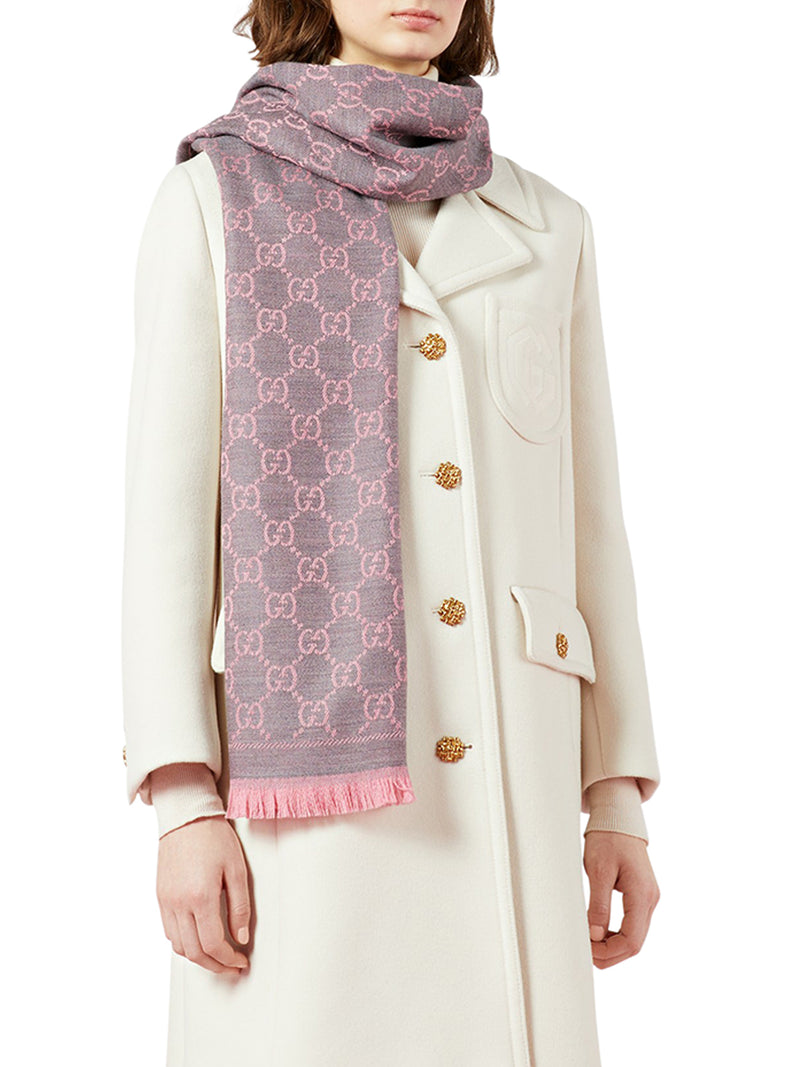-Graphite wool with GG jacquard motif -Fringes at the ends -W48cm x H180cm