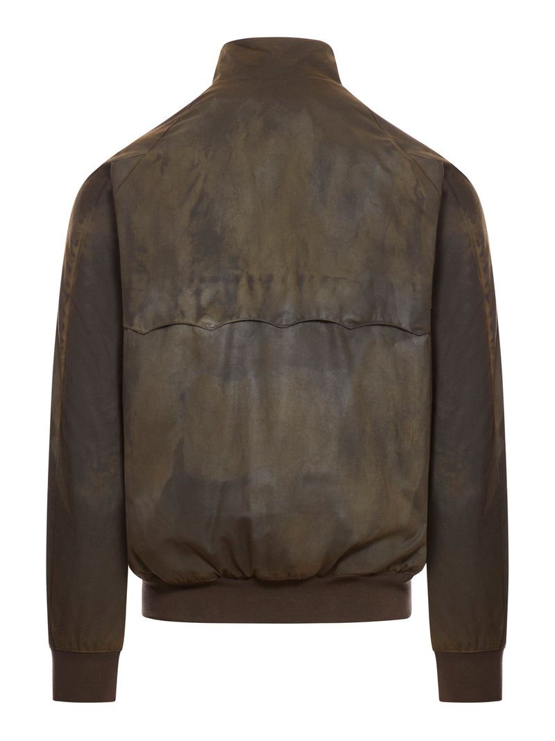 -Umbrella motif shoulder pad -Two-button Baracuta collar with ribbed interior -Zip fastening with double logo slider -Raglan sleeves -Ribbed cuffs and waistband -Front pockets with flap and custom button -Teddy bear lining -Internal pocket made in a contrasting colour with custom button -British Millerain label -100% waxed cotton -Water-repellent -Matte and soft-touch finish -Relaxed Fit