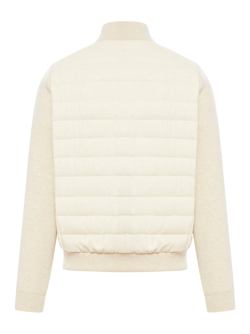 -raised collar -front zip fastening -quilted bust design -two side zip welt pockets -ribbed trims