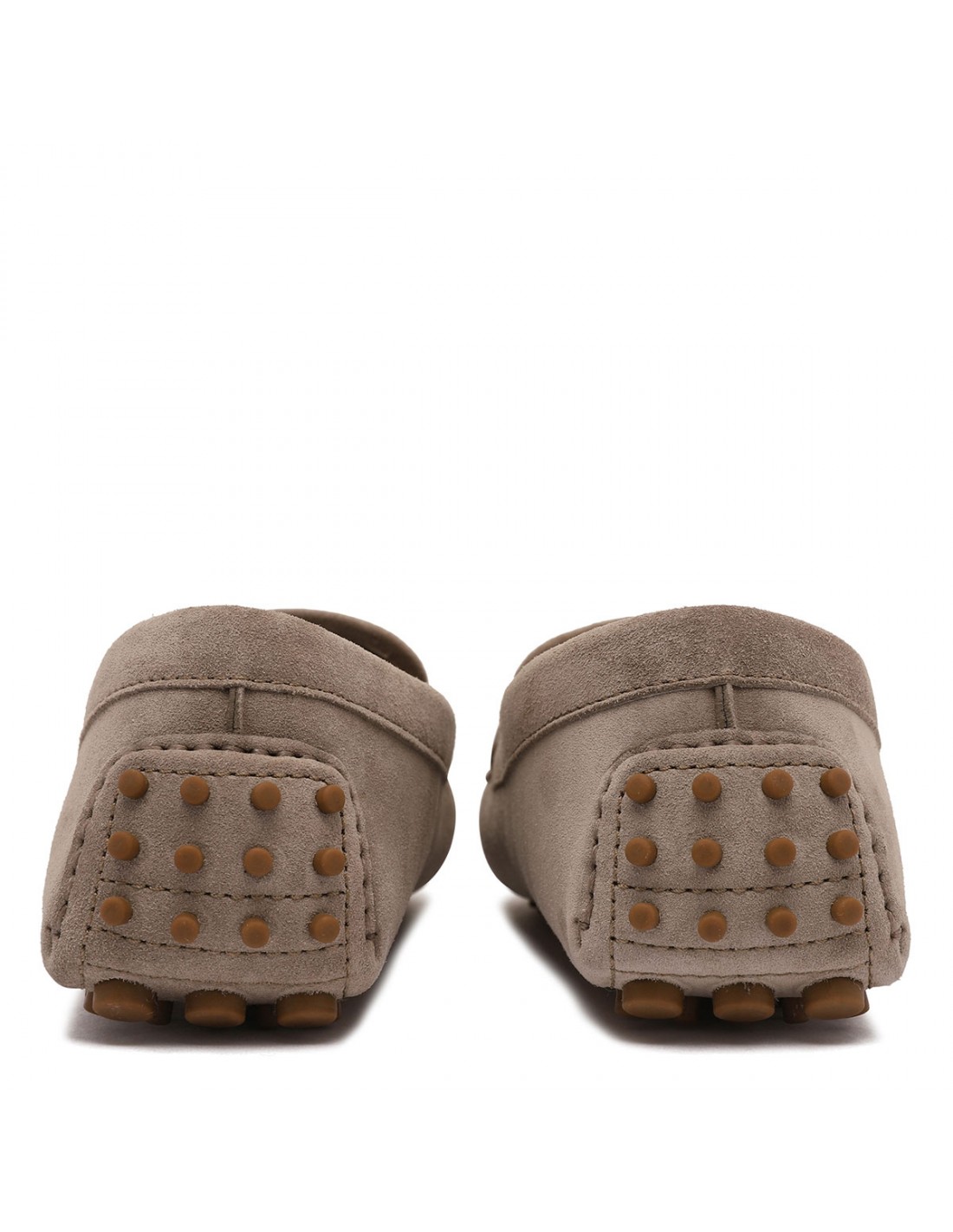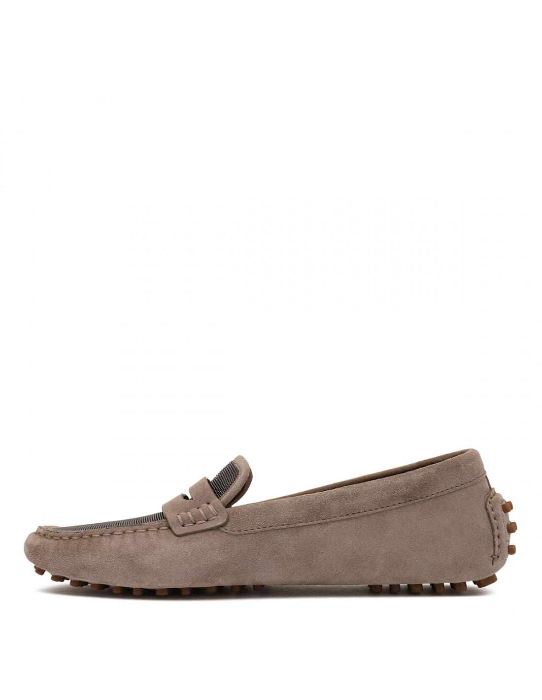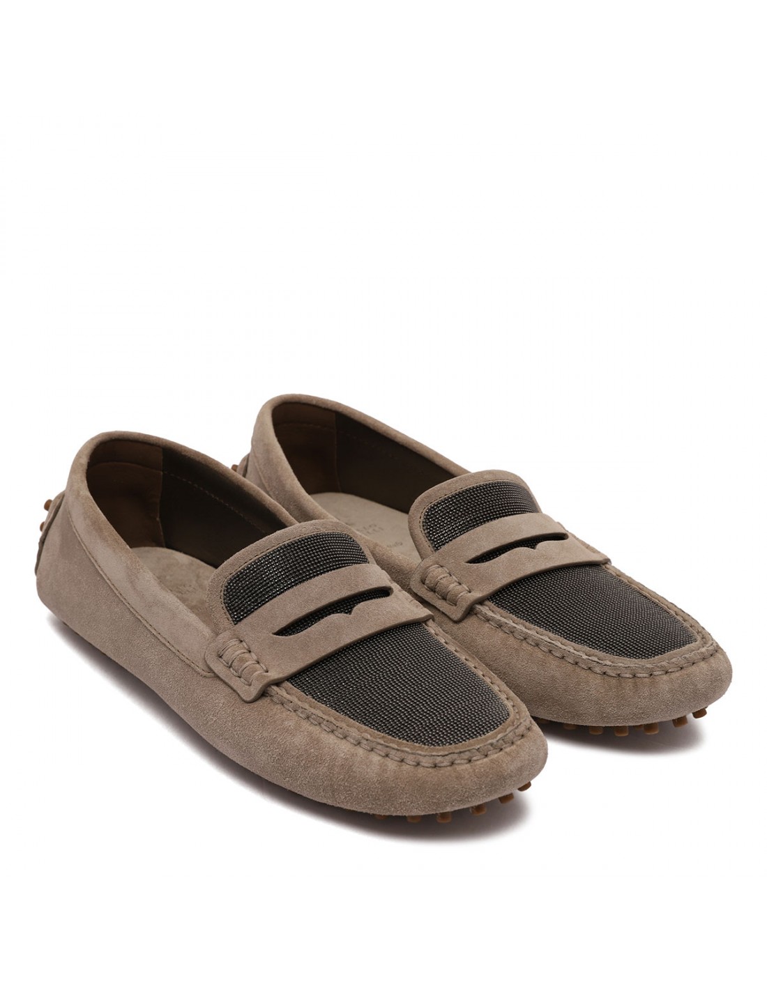 Ice gray velvety suede loafers from Brunello Cucinelli featuring shiny monili detail on upper, penny slot, moc stitching, segmented rubber sole.