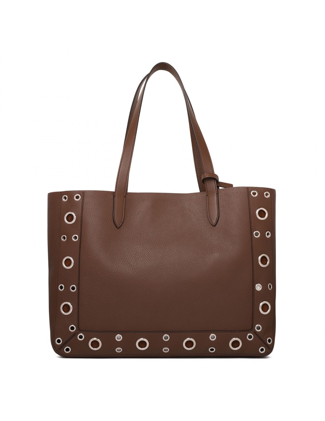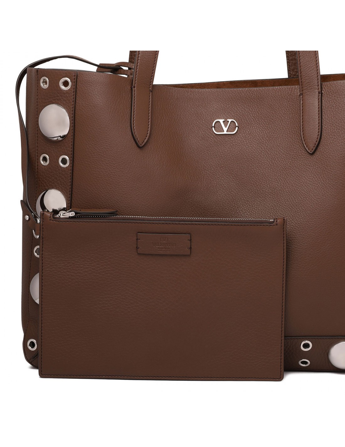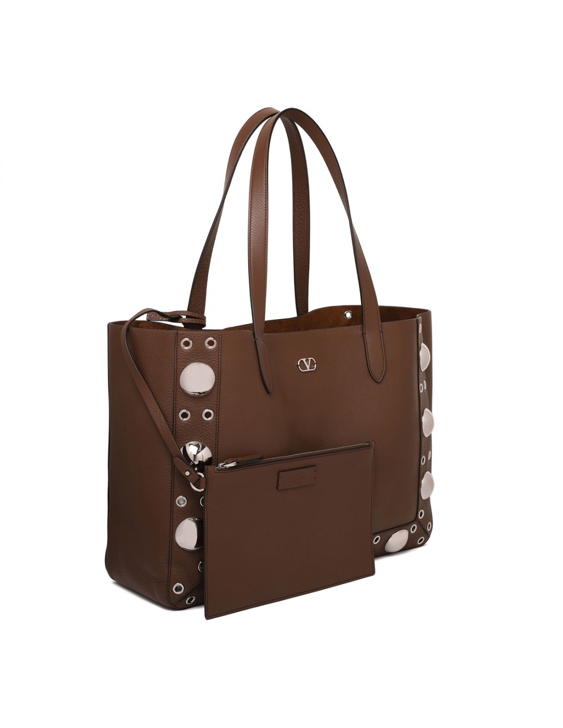 Brown grainy calfskin Nellcote medium tote bag from Valentino Garavani featuring trims decorated with ball studs and rivets, small metallic detail with VLogo Signature, palladium-finish hardware, double long top handle, detachable inner pouch with zip closure.