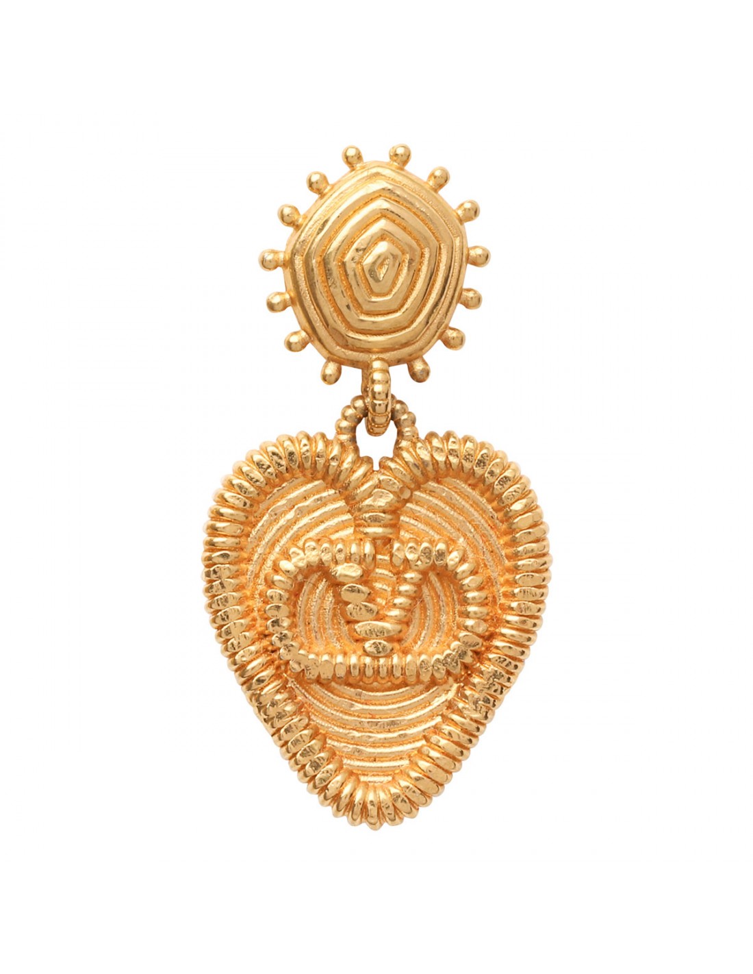 Gold-tone brass fil perdu metal earrings from Valentino Garavani featuring heart-shaped metal motif with hammered workmanship and VLogo Signature detail, push-back fastening.