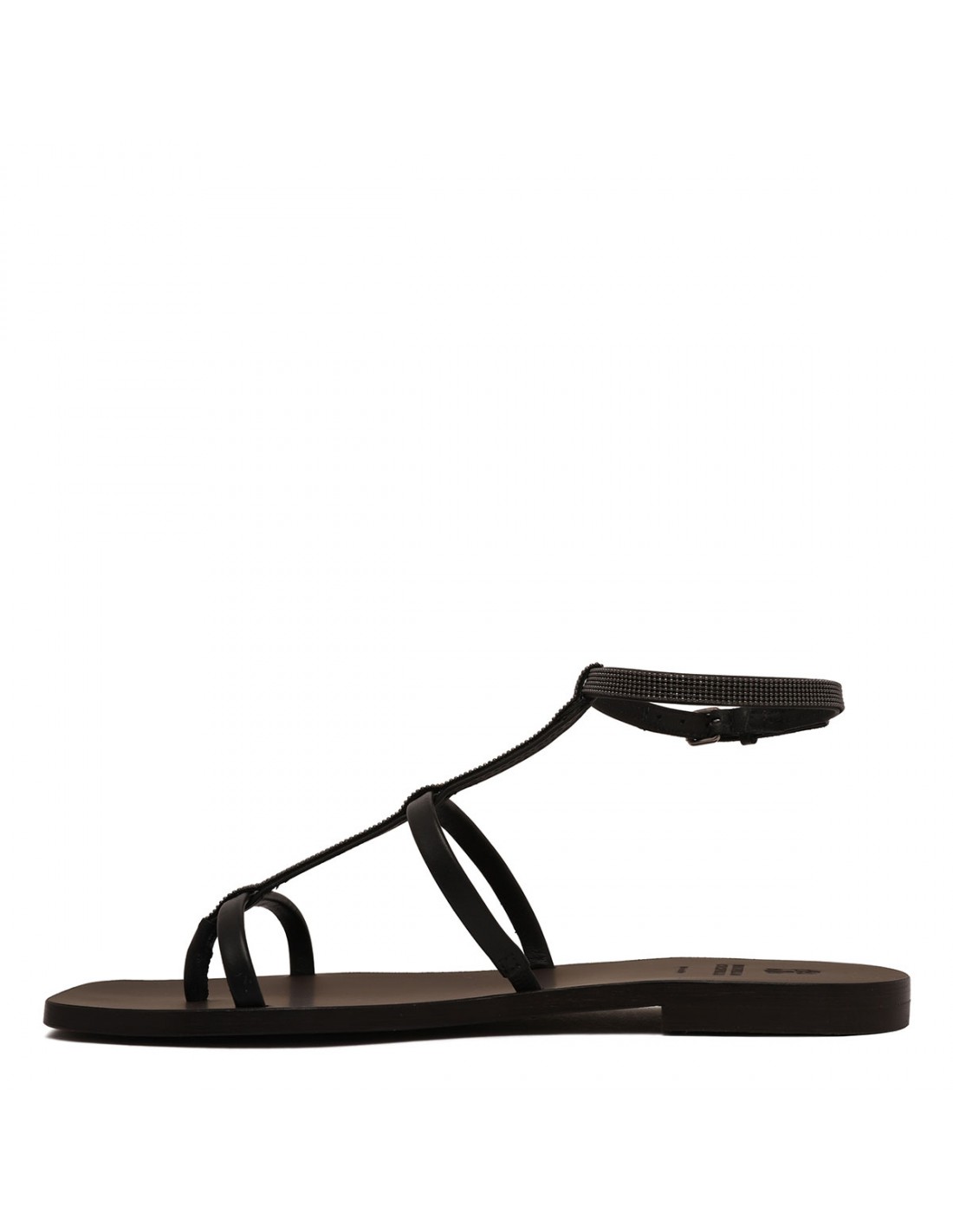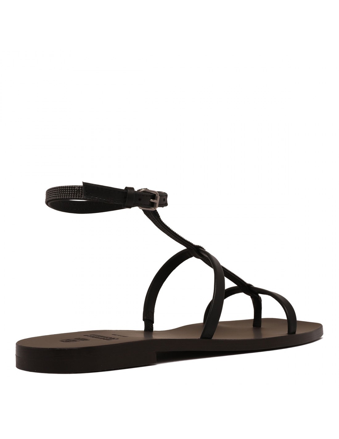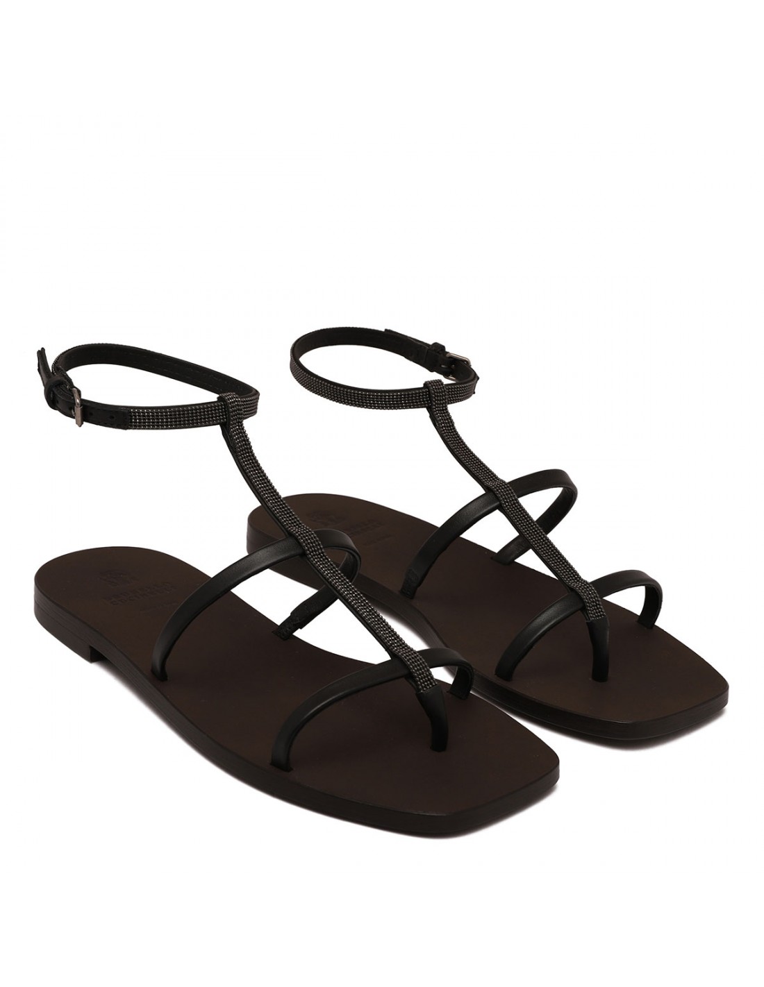 Black nappa leather sandals from Brunello Cucinelli featuring shiny monili-embroidered strap, square open toe, buckle fastening ankle strap, leather insole and sole.