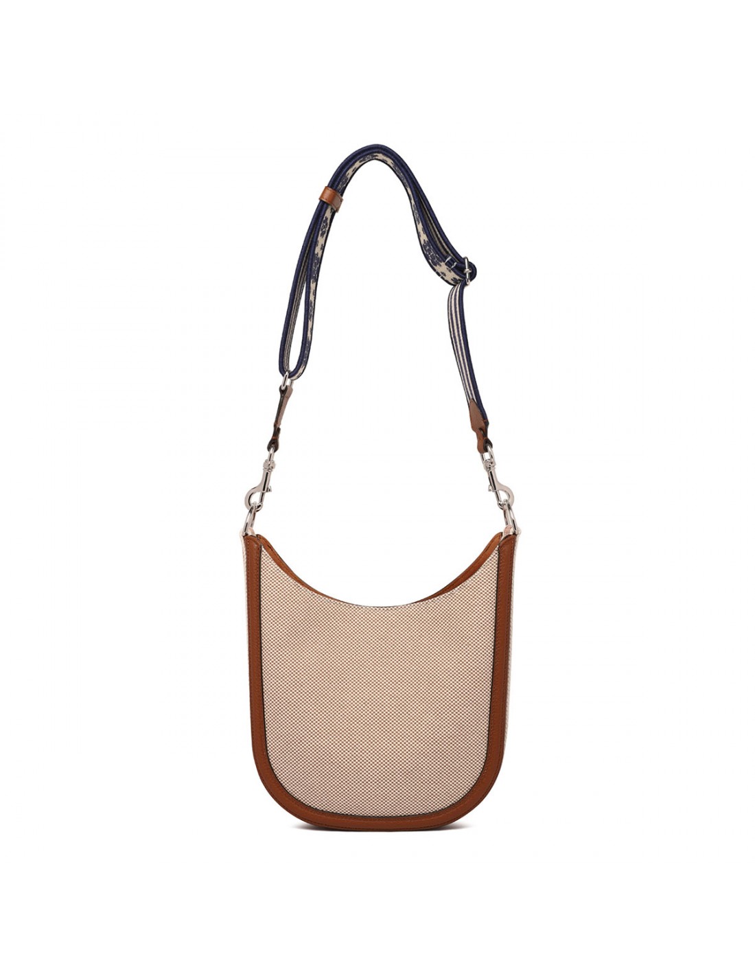Natural hue canvas Antibes medium hobo bag from Valentino Garavani featuring tobacco leather trims, adjustable fabric strap with embroideries, oval-shape leather detail with silver tone metal V logo.