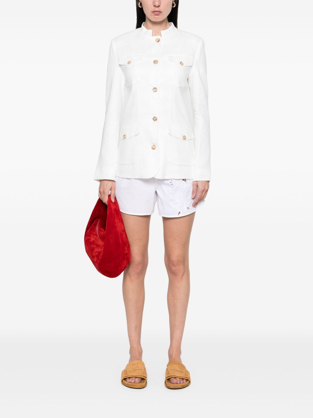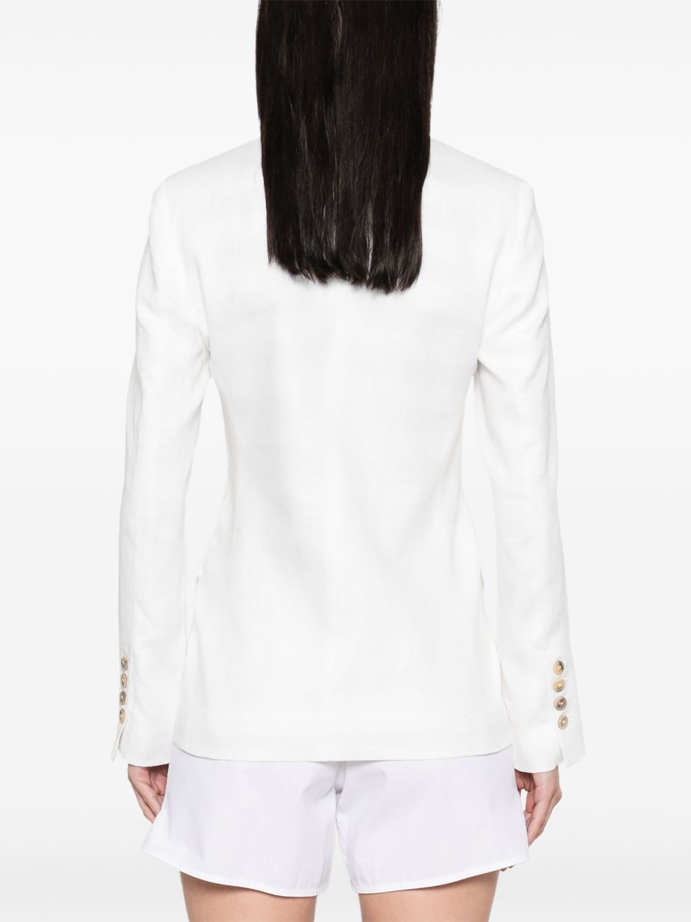 white front button fastening shoulder pads four front flap pockets buttoned cuffs