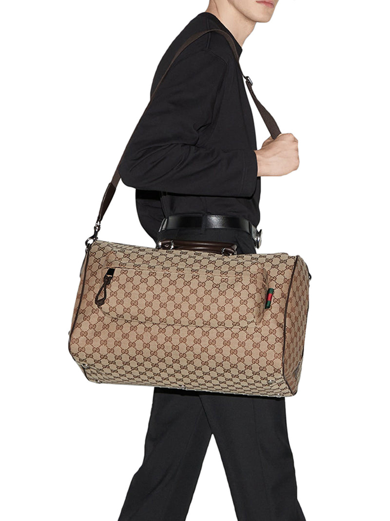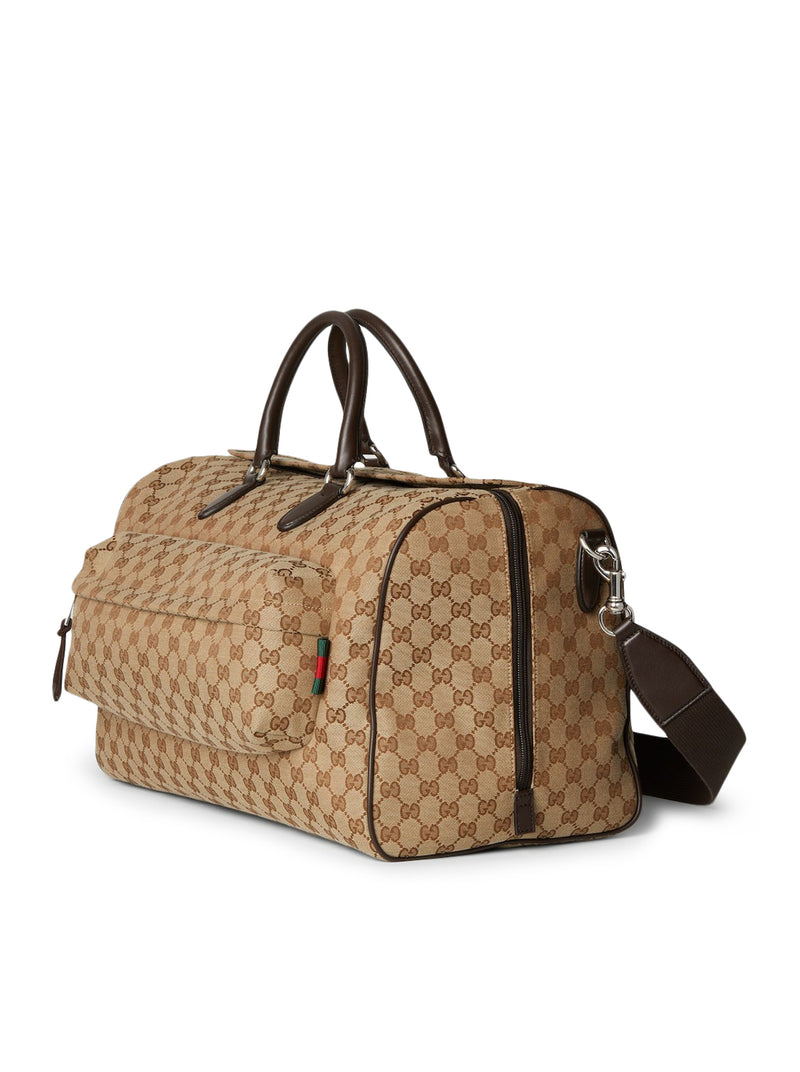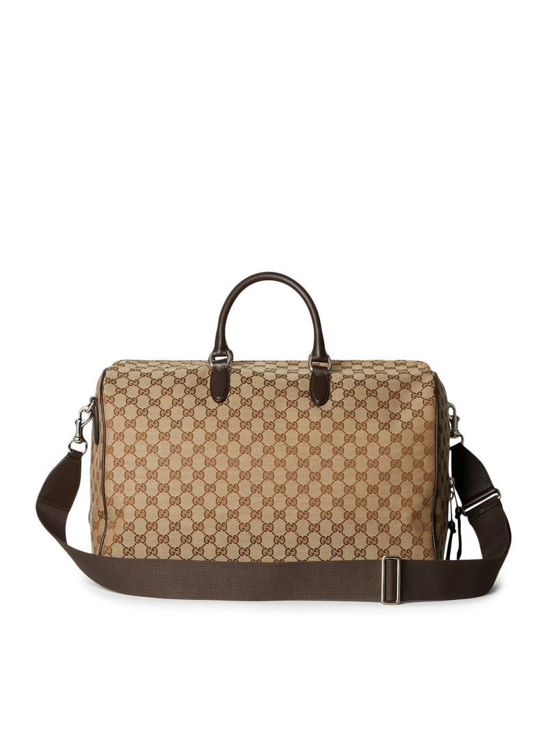 -Beige and ebony Original GG fabric -Grosgrain and brown leather trim -Nylon lining -Embossed Gucci logo, made with a high-frequency embossing technique -Web detail -Interior: 1 zip pocket, 1 open leather pocket and 1 D-ring -Exterior: 1 front zip pocket -Handle, drop: 14 cm -Removable and adjustable fabric shoulder strap, drop: 60 cm; length: 91-149 cm -Zip closure -Medium size: L 45 cm x H 28 cm x D 24 cm -Weight: approximately 1.6 kg