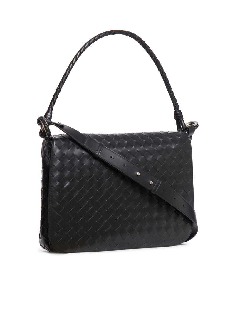 -Intrecciato 15 Avenue bag in black leather with all-over Intrecciato Avenue motif -Features fixed woven leather shoulder strap -adjustable and removable smooth leather shoulder strap -magnetic closure -one main internal compartment -one internal zip pocket -two internal slip pockets -Dimensions: 35x24x7cm