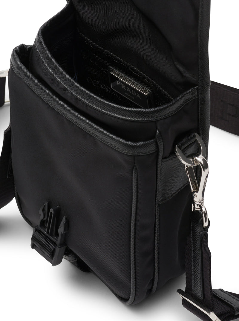 -Adjustable and removable shoulder strap in nylon and leather with removable pocket -Enamelled metal triangle logo on flap -Flap closure with snap system -One external pocket -Signed Re-Nylon lining -Height: 19cm -Width: 14cm -Length: 5.5cm