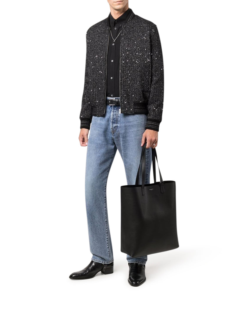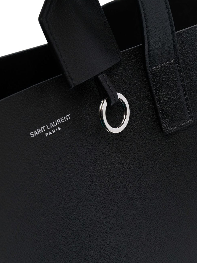 Logo print on the front, leather tag, single compartment, open top and two handles.