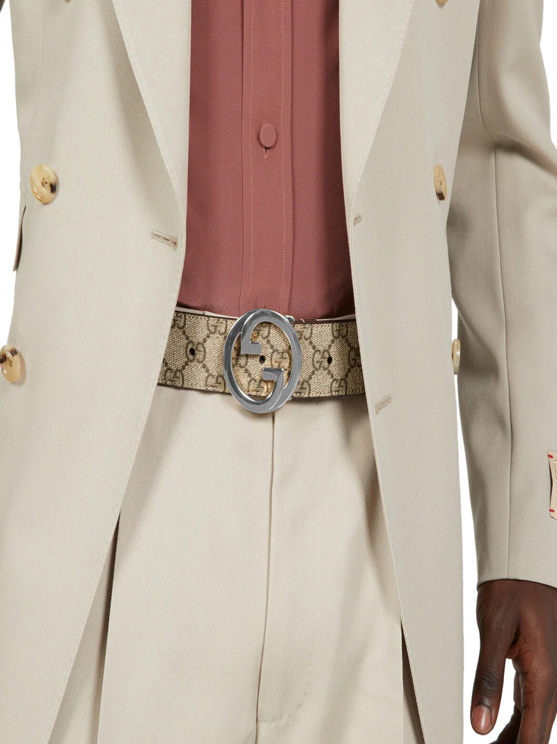 -Beige and ebony Supreme fabric -Brown leather trim -Palladium-colored trim -Round buckle with GG Crossover -Belt height: 4cm