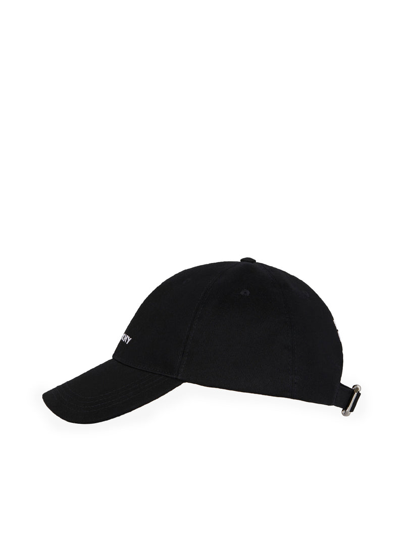 Black cotton serge cap with curved visor, white embroidered GIVENCHY signature on the front and white embroidered 4G logo on the back. Tab with GIVENCHY engraved metal buckle on the back.