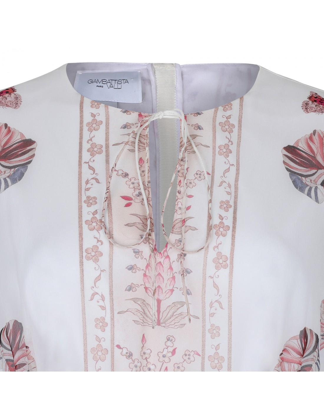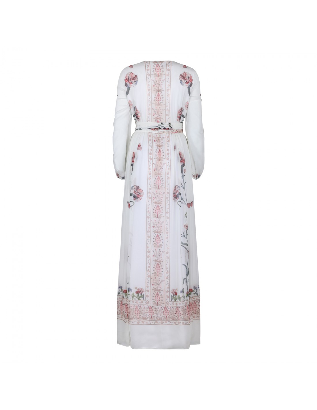 Ivory silk long dress from Giambattista Valli featuring Screen Carnation motif printed allover, crew collar with self-tie, long billowy sleeves, zip fastening along back.