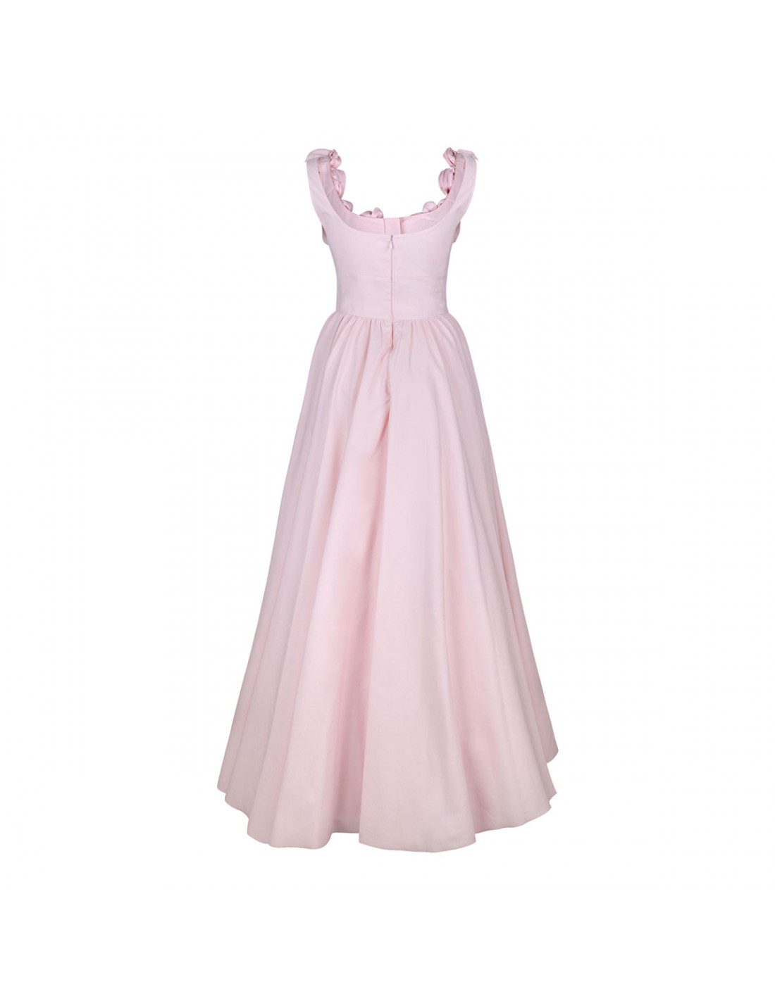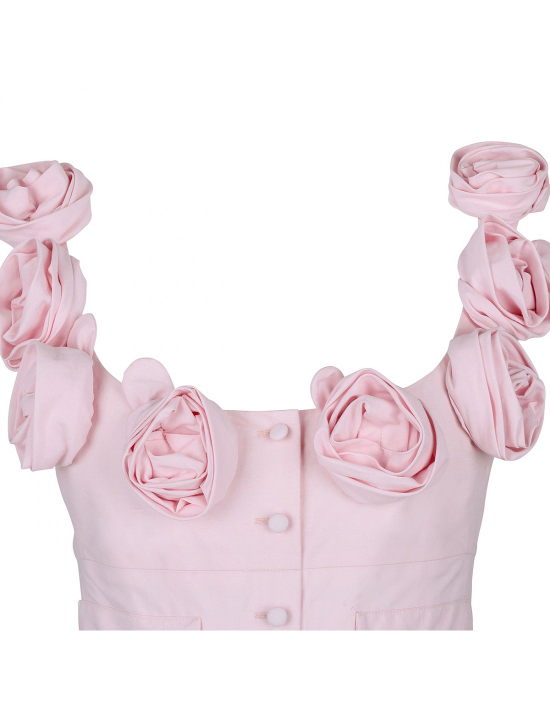 Pale rose poplin maxi skirt from Giambattista Valli featuring neckline decorated with flowers, tow false pockets, concealed zip fastening along back, three buttons on front and tulle lining.