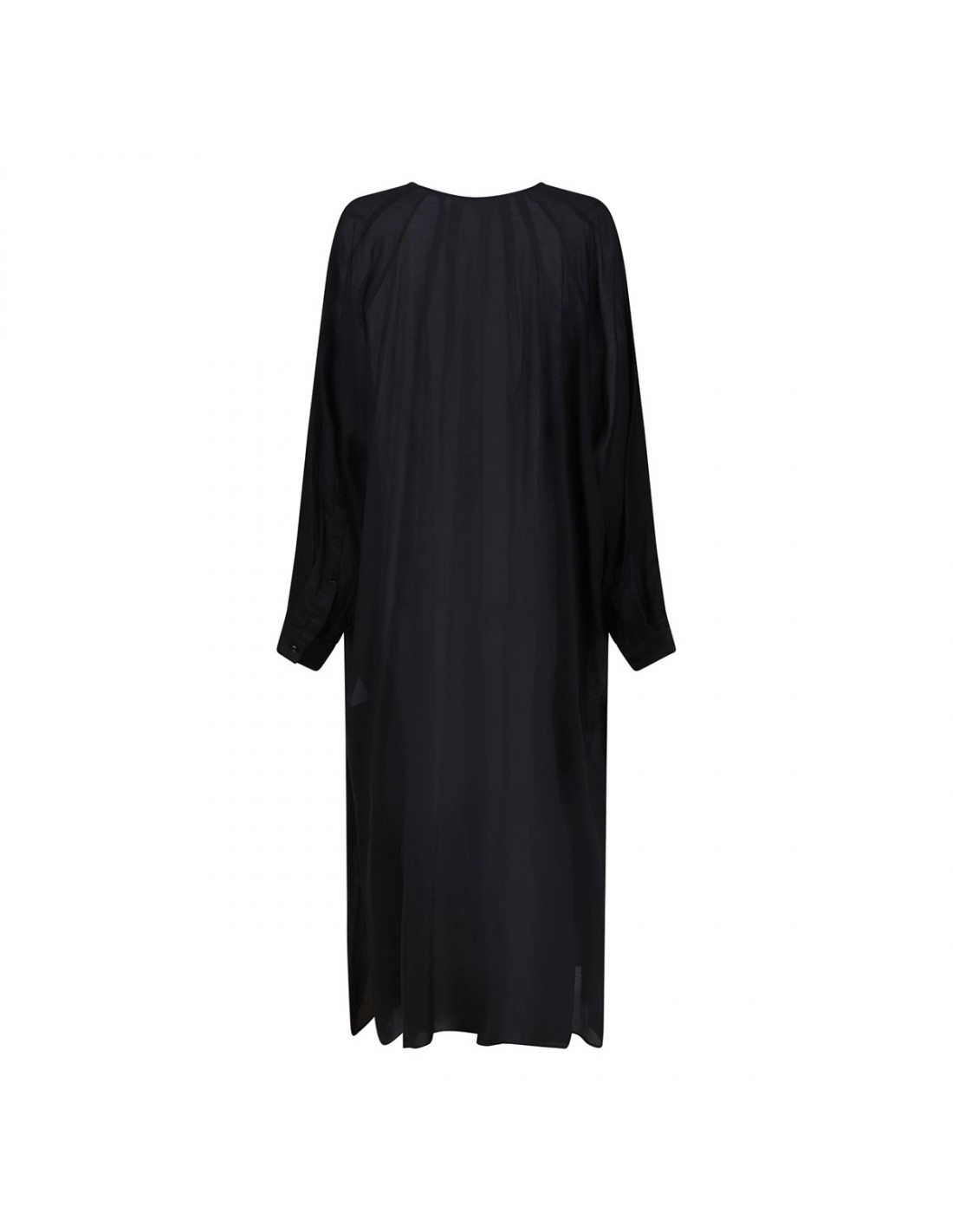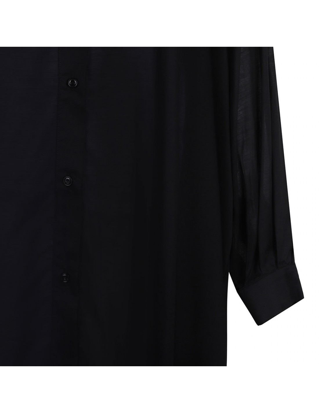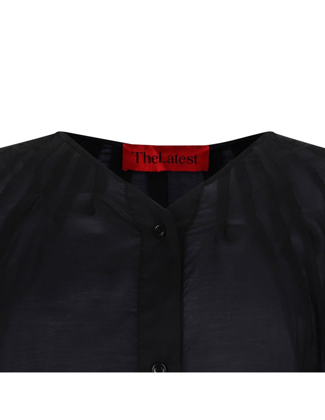 Black cotton blend Bruge sahariana shirt dress from The Latest featuring V-neck, painter long sleeves, button closure, side pockets and side slits.