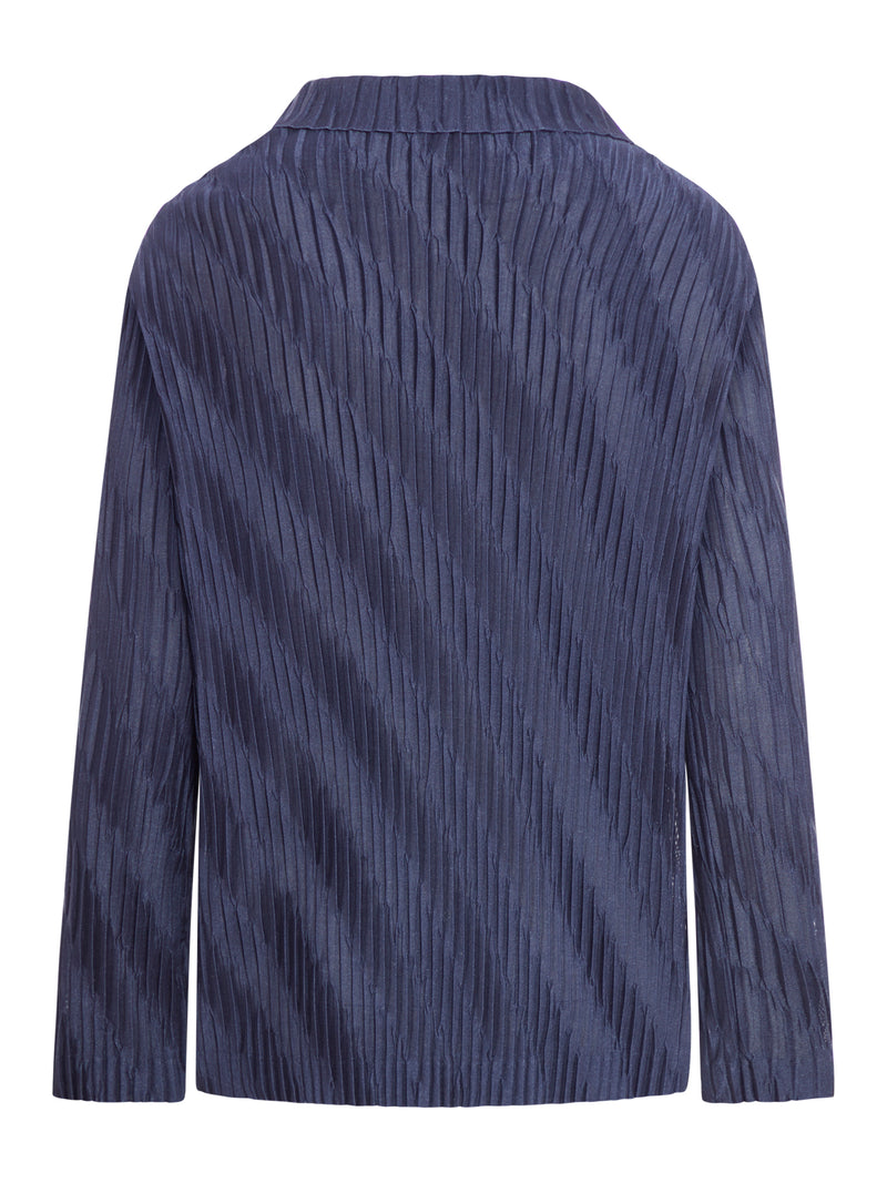 -navy blue -pleated effect -notched lapels -long sleeves -two side welt pockets -partial lining -straight hem -front button fastening