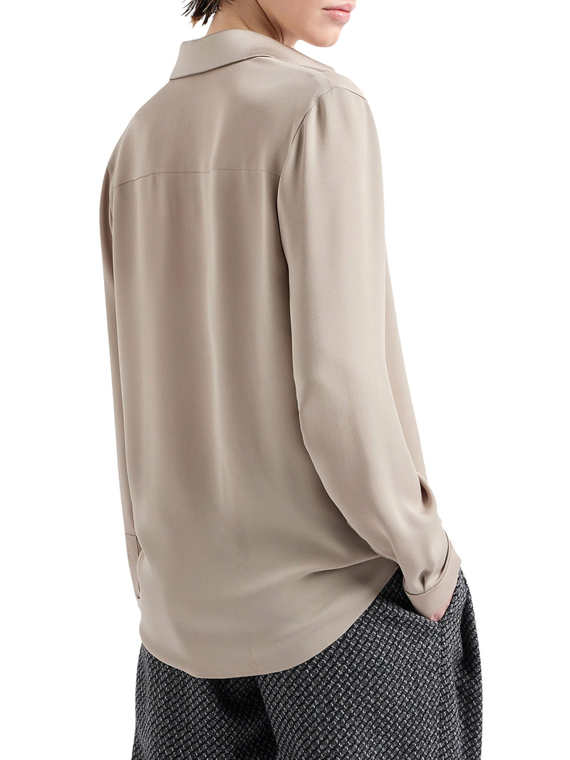 -draped design -classic collar -V-neck -long sleeves -curved hem