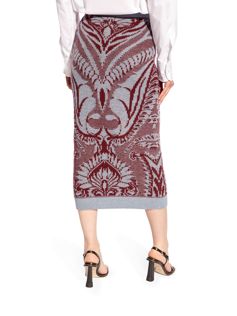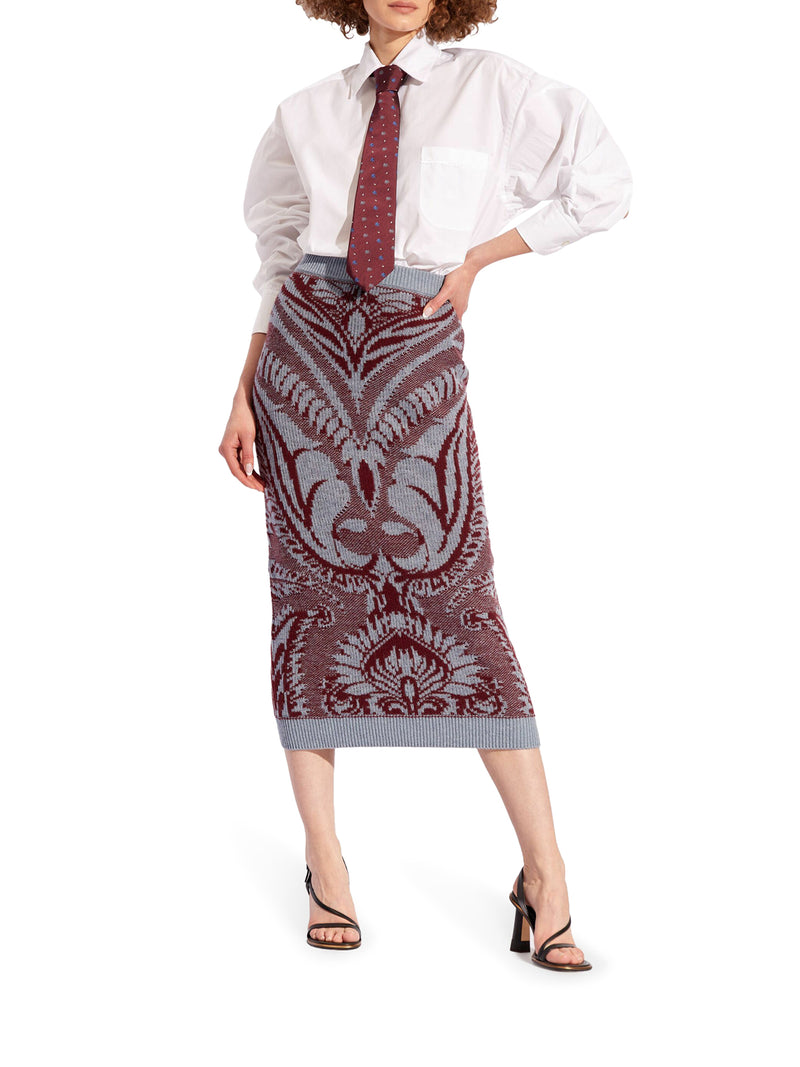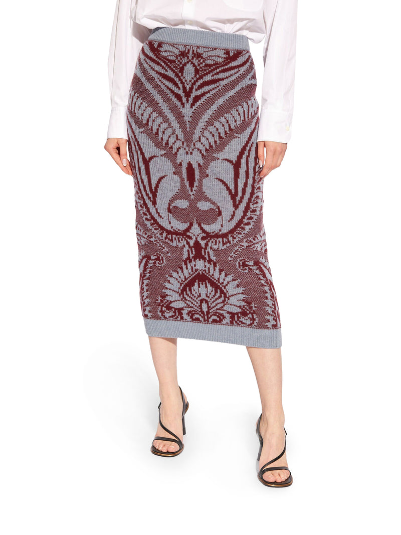 -wool sweater with inlay -high waist -pencil silhouette -ribbed waistband -ribbed hem -below the knee length -straight hem