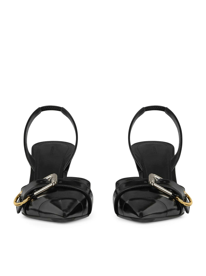 -Brushed calfskin pump. -Voyou line. -Strap on the top with metal buckle. -Thin strap on the back. -Leather insole with embossed GIVENCHY signature. -Gold and silver-finish metal details. -Pointed toe. -Thin heel. -Heel height: 7.5 cm