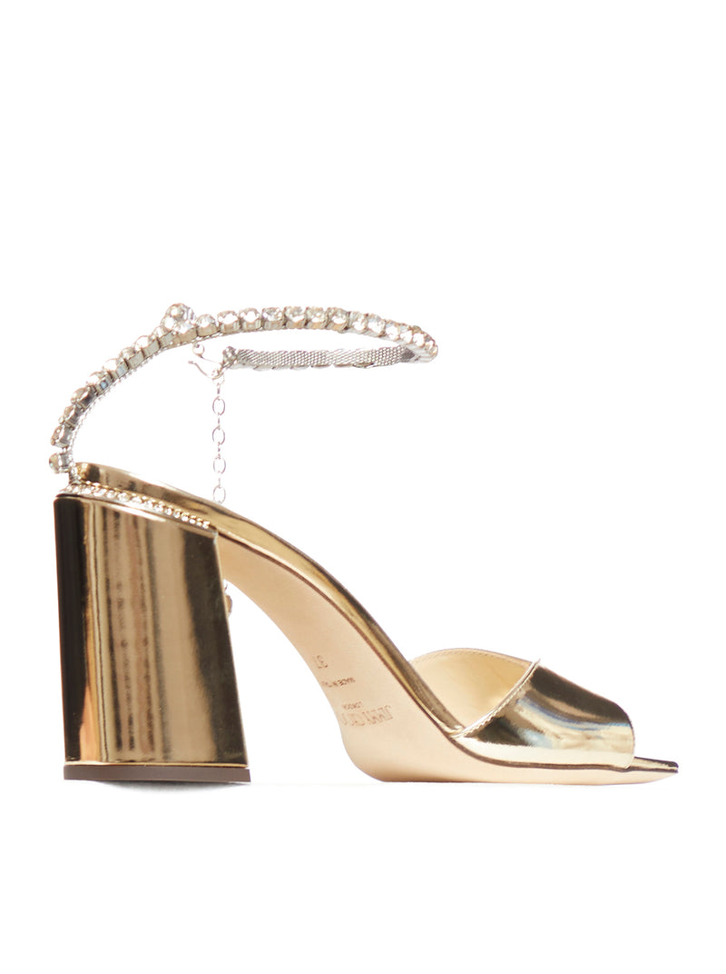 -ankle strap with crystal decoration -open square toe -leather insole with logo and high block heel