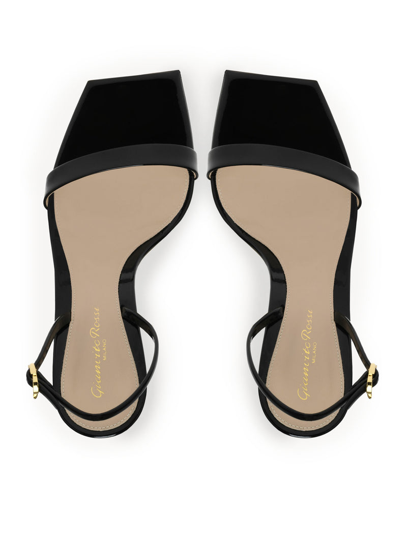 -Square toe sandal -85mm stiletto heel -Gold metal Ribbon buckle featuring the brand's initials on the upper strap