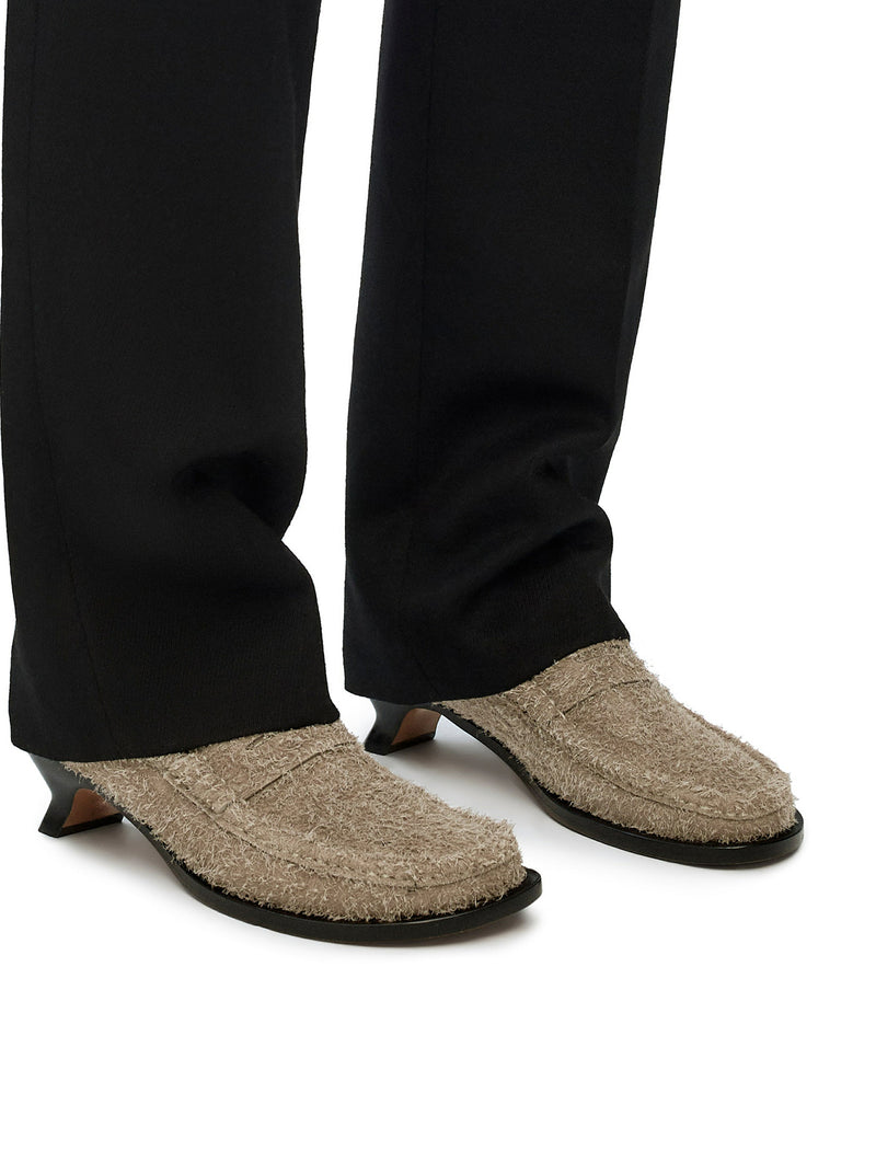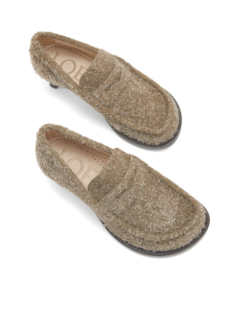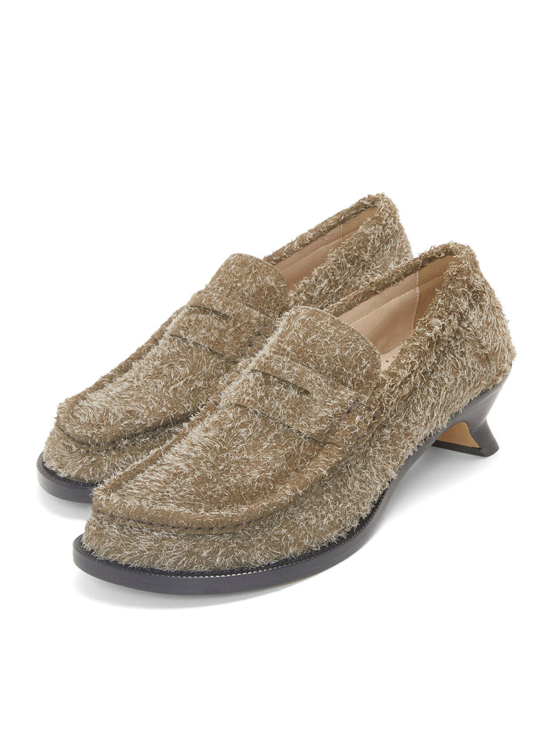 -Kitten heel loafer made of brushed suede featuring the typical LOEWE round toe shape, defined by a voluminous asymmetric look. -Heel height 40mm -Leather sole and extra padded leather insole