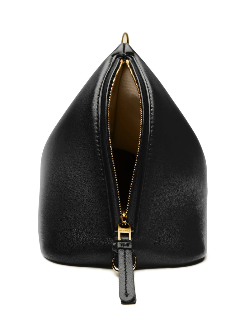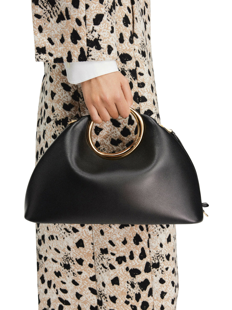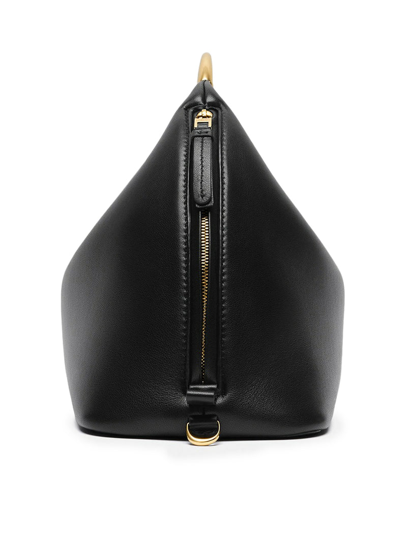 - Nappa leather handbag - Organic shape with integrated engraved ring handle - Magnetic closure - Removable shoulder strap - Two side zip compartments - Flat bottom - Gold metal hardware - Fully lined in cotton - Height 21 cm - Length 33 centimeters - Width 12.5 centimeters