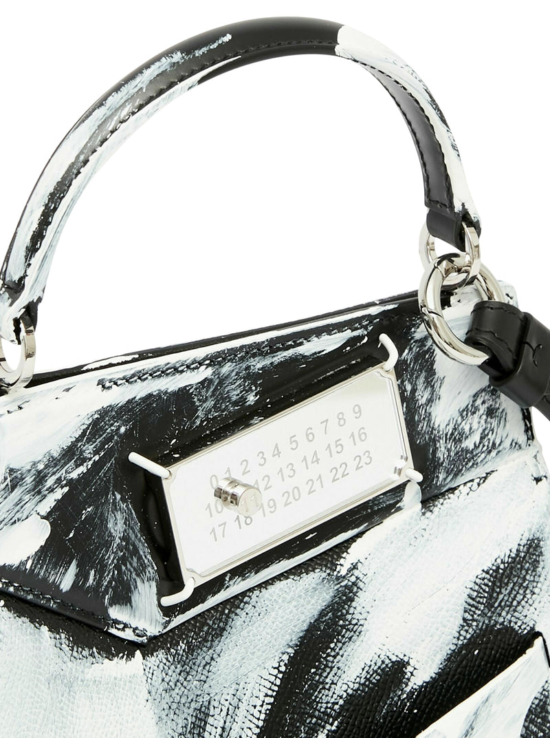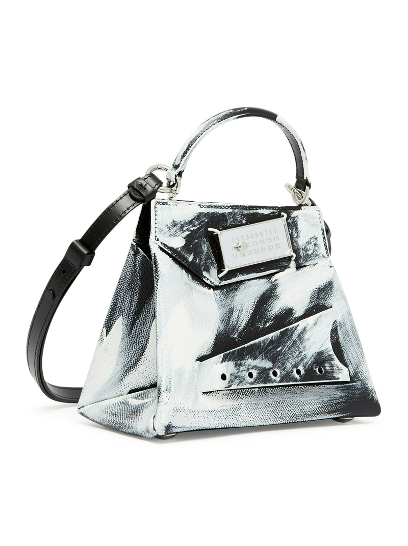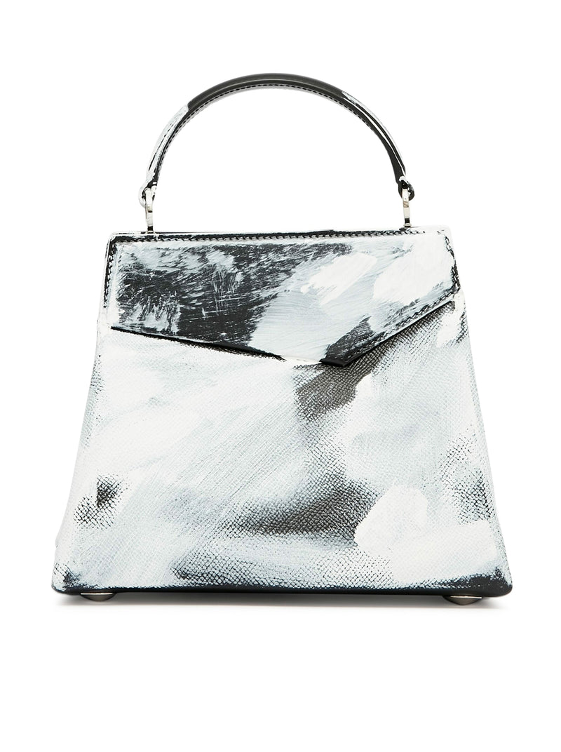 -calf leather -embossed finish -abstract pattern -distinctive logo with numbers -silver-colored logo plaque -front handle -twist closure -flat handle -single compartment