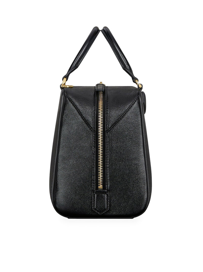 -Mini handbag or shoulder bag in shiny, slightly tumbled buffalo leather. -Antigona Cube line. -Modular cubic shape thanks to the origami-style gusset structure. -Zip closure with GIVENCHY 4G zip pull. -Articulated leather handles with four D-rings for the shoulder strap. -Adjustable and removable leather shoulder strap. -Pentagonal patch with gold-embossed GIVENCHY signature on the front and 4G logo on the back. -Gold-finish metal details. -One main compartment and one flat pocket inside.