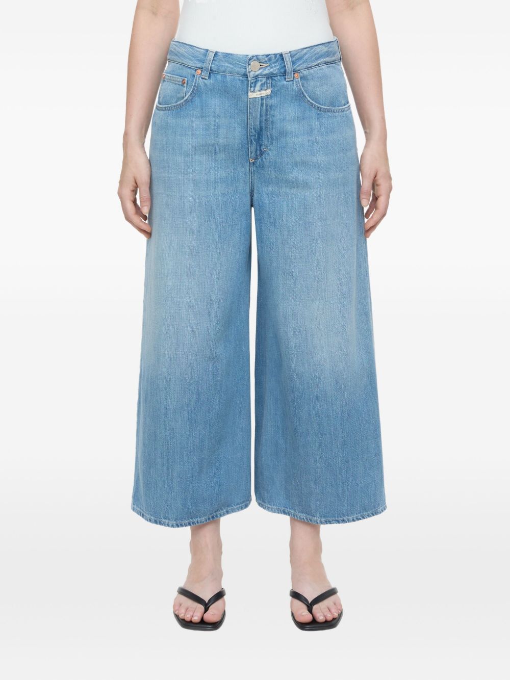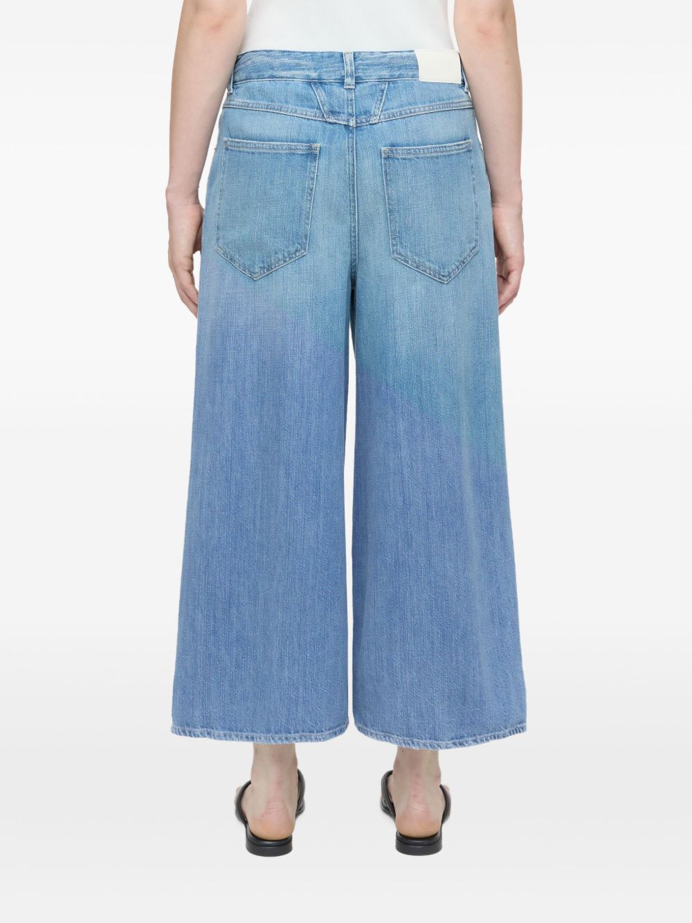 indigo blue front button and zip fastening classic five pockets belt loops logo patch to the rear