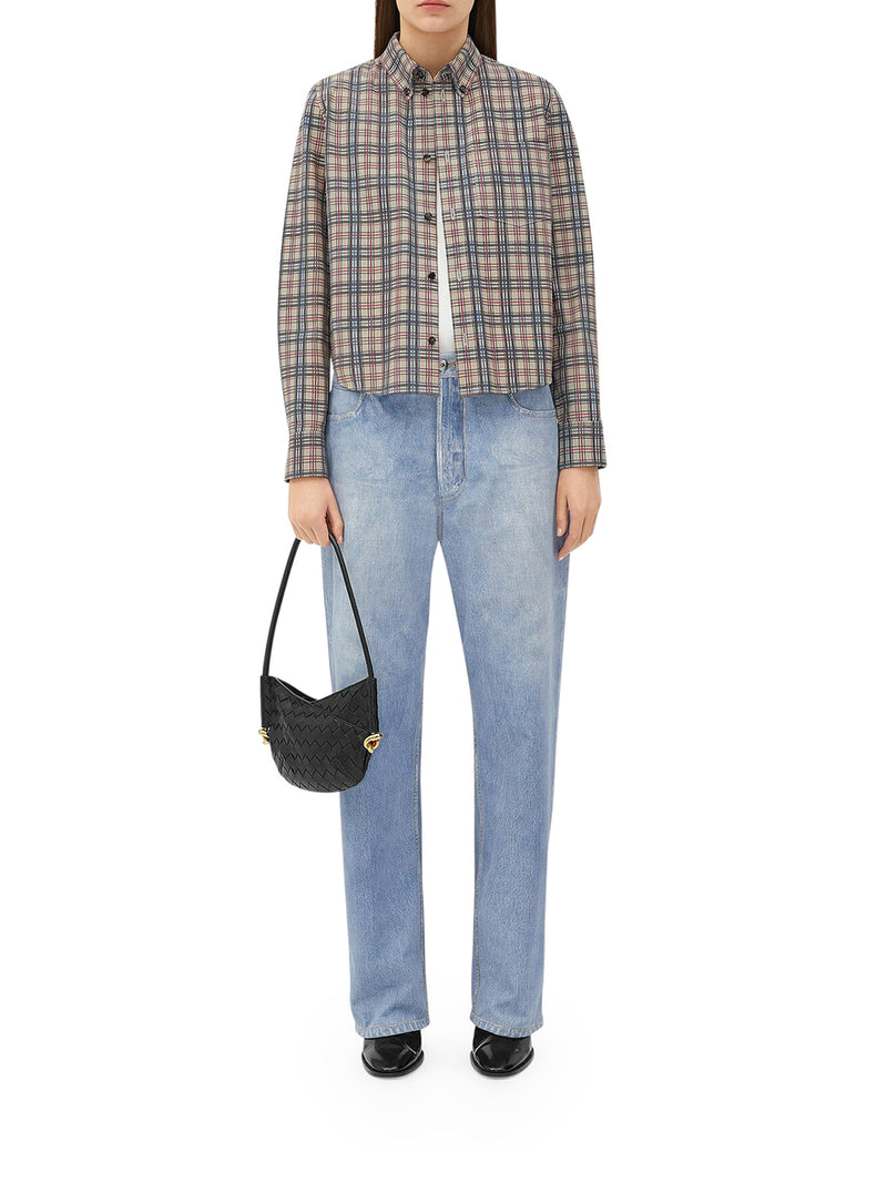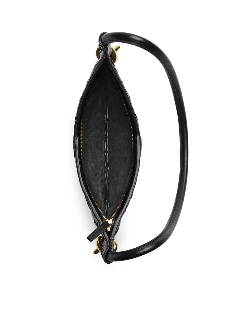 ? Mini shoulder bag in leather with Intrecciato motif ? One main compartment ? Zip closure Material: Lambskin ? Interior: Lined suede ? Colour: Black ? Hardware: Brass finish ? Height: 18 cm ? Width: 28 cm ? Depth: 5 cm ? Handle drop: 25 cm